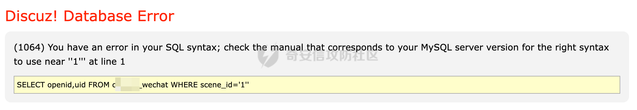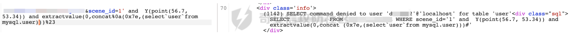 一次失败的SQL注入经历 ============ 0x00 前言 ------- 某天,聚合扫描器推送了一份SQL注入的漏洞报告,经过测试,漏洞点存在某Cloud WAF,没办法直接利用,故需要绕过证明危害,于是笔者花了一点时间对WAF进行了完整的Bypass(最终还是玩了个寂寞)。整个过程,思路虽然比较基础,但总体还是有趣的,在此,分享出来笔者的过程,并呈现自己的思考。 0x01 WAF识别 ---------- 1)SQL注入点 目标站点Discuz的微信扫描插件存在SQL注入,直接传入单引号可以引发报错  2)尝试进行报错注入,WAF出现拦截,经过Google搜索 尝试payload: `scene_id=1' and extractvalue(0, user())`  根据特征搜索google,发现WhatWaf这个项目有人提交了WAF,属于unkown类型的。 <https://github.com/Ekultek/WhatWaf/issues/856> <https://github.com/Ekultek/WhatWaf/issues/1568> 看来这个WAF不是很常见,平时经常看到一些各种FUZZ 安全狗和云锁的Bypass的文章,但是实战的时候,我发现安全狗直接拦截`select from`的结构,由于太菜没办法绕过,故对于WAF一直保持自闭,所以遇到这个少众的waf我有点兴奋,心里暗想这波总算遇到好捏的柿子了。 0x02 篇章: Bypassed ----------------- 正常来说,我们提交漏洞,只需要证明能获取到数据库信息即可,并不需要去获取数据,所以只是为了证明漏洞真实存在的话,难度会低一些,但是如果想尝试获取完整的数据,甚至是通过去查询information\_schema库来获取到完整数据库的结构信息,从而获取到指定的敏感数据的话,就需要进行完整Bypass。 > 这个WAF其实挺聪明的,我尝试构造畸形数据包,比如分块传输和脏数据都没能绕过它,一直以来在我的认知里面,超大的数据对于绕waf来说是挺好用的,因为这是一个性能和安全的不可调和的矛盾。 > > 不过在测试的过程,我发现它处理大数据其实是"比较聪明"的,无论多大的数据他都能处理,由于自己才疏学浅,最后只能从语义上面进行bypass了。 ### 0x2.1 漏洞证明 **常规尝试** 1.尝试`1' and extractvalue(0, user())%23`发现被拦截, 删掉and, 即`1' extractvalue(0, user())%23`发现可以绕过。 2.尝试`1'^extractvalue(0, user())%23` 成功绕过  3.尝试`1'^extractvalue(0, database())%23` 被拦截,说明了什么呢? 说明`database()`被重点关照了。 4.因为一般漏洞审核的标准是获取到数据库名,只能尝试继续在database身上下功夫了。 ```php 1'^extractvalue(0, database/*%0a*/())%23 1'^extractvalue(0, $Fuzz$database$Fuzz$())%23 ```  Fuzz一圈没有结果,发现`1'^extractvalue(0, database` 这个完全错误的语句都被拦截,只能将database从中间拆分才可以绕过,才能破坏掉WAF的语义。  后面也陆陆续续测了不少思路,比如换行呀,尝试其他连接字符,`/**/`各种注释Fuzz,就不展开说了,下面主要讲讲自己怎么绕过,最终完美地执行`extractvalue(0, database())`语句。 **Fuzz 内置函数** 在尝试的过程中我发现一个现象,当我传入`1' anxd extractvalue(0, database())%23` 或者删掉`anxd`的时候,waf是放行的,但是如果传入一些常规的操作字符,比如`and`, `&`,`or`,`>`,`<`字符waf则是拦截的,继续尝试官方文档里面的操作符号: <https://dev.mysql.com/doc/refman/8.0/en/non-typed-operators.html>, 最终结果,发现大多数都是不行的,但是Fuzz的过程中,我发现了一个很有趣的,可能导致绕过的点,那就是WAF似乎没办法处理一些不常见的函数,尝试如下: `1' md5(1) extractvalue(0, database())%23` 拦截 `1' mdx5(1) extractvalue(0, database())%23` 不拦截 `1' and mdx5(1) and extractvalue(0, database())%23`不拦截 `1' and md5(1) and extractvalue(0, database())%23` 拦截 `1' and sleep(1) and extractvalue(0, database())%23` 拦截 `1' and hex(1) and extractvalue(0, database())%23` 拦截 想到的常规函数都是被拦截,但仅仅依靠自己薄弱的知识面是不全面的,所以我直接从官方文档: <https://dev.mysql.com/doc/refman/5.7/en/built-in-function-reference.html> 里面提取所有内置函数进行FUZZ,写个脚本提取下即可,大概424个内置函数。 ```javascript // https://dev.mysql.com/doc/refman/5.7/en/built-in-function-reference.html selector = document.querySelectorAll('#docs-body > div > div.table > div:nth-child(3) > table > tbody > tr > th > a > code'); alls = ""; _function = ""; for (index = 0; index < selector.length; index++) { _function = selector[index].textContent; console.log(_function); alls += _function + '\n' } var aux = document.createElement("textarea"); aux.value = alls; document.body.appendChild(aux); aux.select();document.execCommand("copy"); document.body.removeChild(aux); console.log("复制成功!"); ```  经过FUZZ,前面比较常规的函数,都被WAF拦截了,另外有一些不常见的函数,都会提示`FUNCTION xxxx.JSON_DEPTH does not exist`,版本的问题,但功夫不负有心人,发现最终我找到一个函数`Y`,是可能导致绕过,且不会报错的,这个函数看起来很有感觉,比较短。 > Y函数: > [https://dev.mysql.com/doc/refman/5.7/en/gis-point-property-functions.html#function\_y](https://dev.mysql.com/doc/refman/5.7/en/gis-point-property-functions.html#function_y) > > 虽然官方函数没有给出示例用法,但是给出了ST\_Y()的用法,这个ST\_Y()在目标环境是不存在报错的,但这两个函数的用法是一致的。 > >  > Usage: > > ```bash > mysql> SELECT ST_Y(Point(56.7, 53.34)); > +--------------------------+ > | ST_Y(Point(56.7, 53.34)) | > +--------------------------+ > | 53.34 | > +--------------------------+ > ``` 尝试payload: `scene_id=1' and Y(point(56.7, 53.34)) and extractvalue(0,database())%23` ,没有waf拦截,但是没有返回报错。  这又是为什么呢? 这里需要注意一个很经典的问题,很多人并不是很了解extractvalue的报错原理: 本质在于第二个参数的