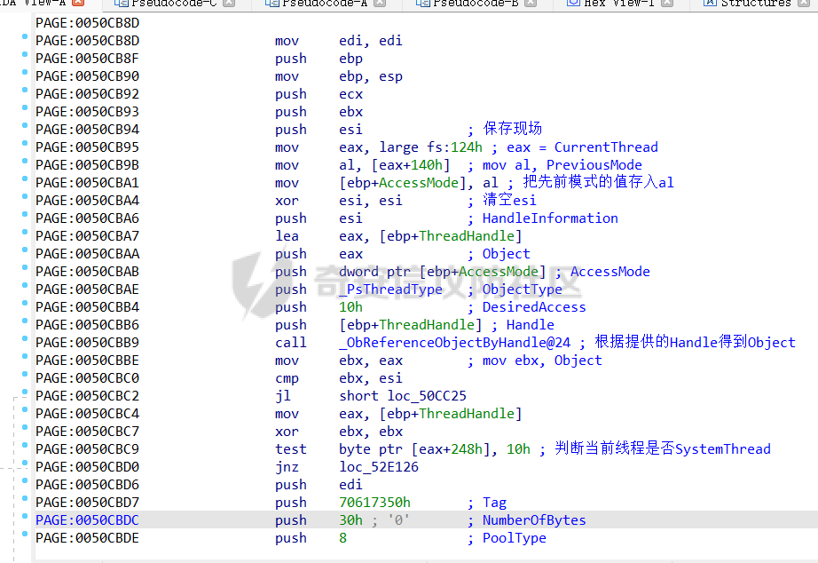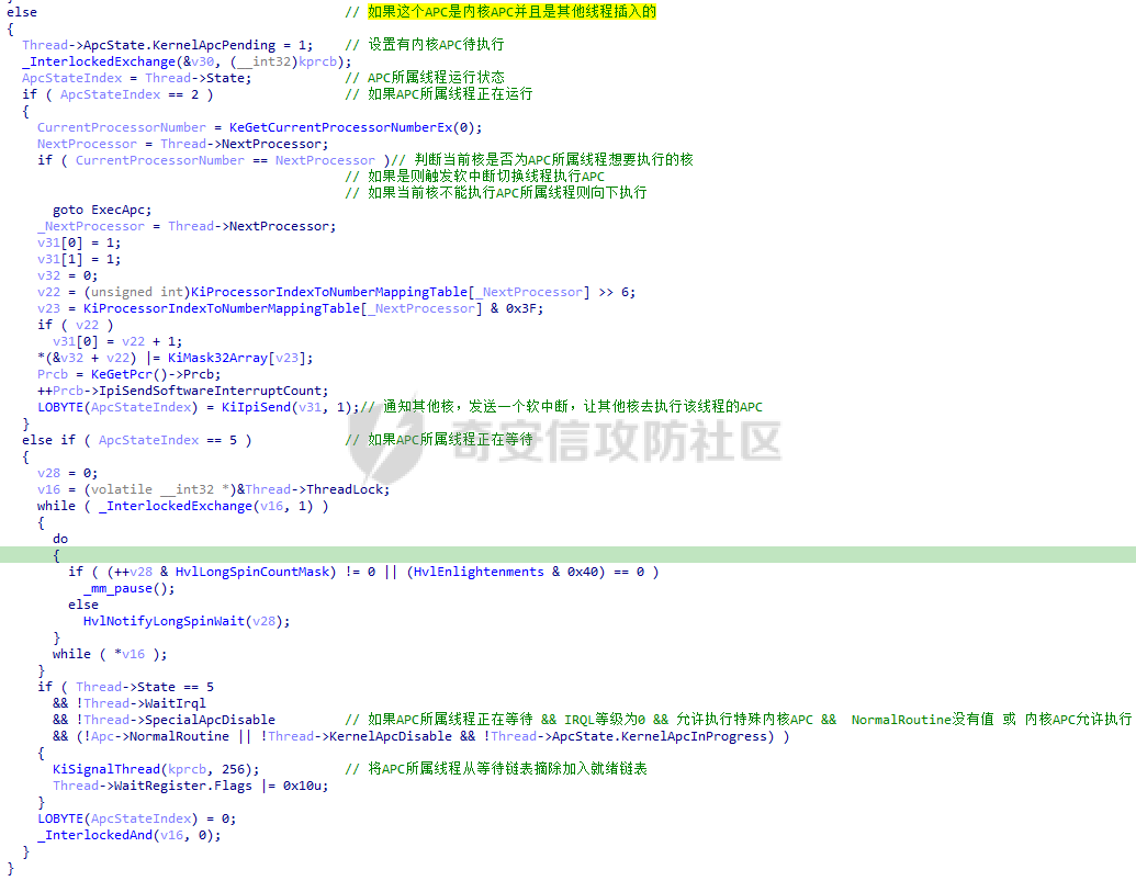 0x01 本质 ======= `APC`(Asynchronous Procedure Call 异步过程调用)是一种可以在 Windows 中使用的机制,用于将要在特定线程上下文中完成的作业排队。 线程是不能被“杀掉”、“挂起”、“恢复”的,线程在执行的时候自己占据着CPU,别人怎么可能控制它呢? 举个极端的例子:如果不调用API,屏蔽中断,并保证代码不出现异常,线程将永久占用CPU,何谈控制呢?所以说线程如果想“死”,一定是自己执行代码把自己杀死,不存在“他杀”这种情况! 那如果想改变一个线程的行为该怎么办呢? 可以给他提供一个函数,让它自己去调用,这个函数就是APC(Asyncroneus Procedure Call),即异步过程调用。 APC队列 ----- ```c++ kd> dt _KTHREAD nt!_KTHREAD ... +0x034 ApcState : _KAPC_STATE ... kd> dt _KAPC_STATE nt!_KAPC_STATE +0x000 ApcListHead //2个APC队列 用户APC和内核APC +0x010 Process //线程所属或者所挂靠的进程 +0x014 KernelApcInProgress //内核APC是否正在执行 +0x015 KernelApcPending //是否有正在等待执行的内核APC +0x016 UserApcPending //是否有正在等待执行的用户APC 用户APC:APC函数地址位于用户空间,在用户空间执行 内核APC:APC函数地址位于内核空间,在内核空间执行 ``` `NormalRoutine`会找到你提供的APC函数,并不完全等于APC函数的地址。  APC函数何时被执行? KiServiceExit函数: 这个函数是系统调用、异常或中断返回用户空间的必经之路。 KiDeliverApc函数: 负责执行APC函数 逆向TerminateThread/ResumeThread ------------------------------    自己实现APC队列的插入,在3环调用`QueueUserAPC` ```c++ // APC1.cpp : 此文件包含 "main" 函数。程序执行将在此处开始并结束。 // #include <iostream> #include <Windows.h> DWORD WINAPI MyThread(LPVOID) { int i = 0; while (true) { SleepEx(300, TRUE); printf("%d\n", i++); } } void __stdcall MyApcFunction(LPVOID) { printf("Run APCFuntion\n"); printf("APCFunction done\n"); } int main(int argc, char* argv[]) { HANDLE hThread = CreateThread(0, 0, MyThread, 0, 0, 0); Sleep(1000); if (!QueueUserAPC((PAPCFUNC)MyApcFunction, hThread, NULL)) { printf("QueueUserAPC error : %d\n", GetLastError()); } getchar(); return 0; } ```   QueueUserApc ------------ 通过**3环的QueueUserApc函数可以完成将APC插入到队列的操作**,首先调用了`ntdll.dll`的`NtQueueApcThread`   然后通过`0xB4`的调用号进入ring0  在windbg里面对应的内核函数为`NtQueueApcThread`  然后在`ntosknl.exe`里面定位到`NtQueueApcThread`  最后是调用`KeInitializeApc`和`KeInsertQueueApc`这两个函数来实现APC的效果  0x02备用APC ========= 备用APC里面有几个重要的成员 ```c++ kd> dt _KTHREAD nt!_KTHREAD ... +0x034 ApcState : _KAPC_STATE ... +0x138 ApcStatePointer : [2] Ptr32 _KAPC_STATE ... +0x14c SavedApcState : _KAPC_STATE ... +0x165 ApcStateIndex : UChar +0x166 ApcQueueable : UChar ``` **SavedApcState** ----------------- 线程APC队列中的APC函数都是与进程相关联的,具体点说:A进程的T线程中的所有APC函数,要访问的内存地址都是A进程的。 但线程是可以挂靠到其他的进程:比如A进程的线程T,通过修改Cr3(改为B进程的页目录基址),就可以访问B进程地址空间,即所谓“进程挂靠”。 当T线程挂靠B进程后,APC队列中存储的却仍然是原来的APC,具体点说,比如某个APC函数要读取一个地址为0x12345678的数据,如果此时进行读取,读到的将是B进程的地址空间,这样逻辑就错误了 为了避免混乱,在T线程挂靠B进程时,会将`ApcState`中的值暂时存储到`SavedApcState`中,等回到原进程A时,再将APC队列恢复。 所以,`SavedApcState`又称为备用APC队列。 **挂靠环境下ApcState的意义** -------------------- 在挂靠的环境下,也是可以向线程APC队列插入APC的,那这种情况下,使用的是哪个APC队列呢? A进程的T线程挂靠B进程,A是T的所属进程,B是T的挂靠进程 > ApcState B进程相关的APC函数 > > SavedApcState A进程相关的APC函数 在正常情况下,当前进程就是所属进程A,如果是挂靠情况下,当前进程就是挂靠进程B。 ApcStatePointer --------------- 为了操作方便,`_KTHREAD`结构体中定义了一个指针数组`ApcStatePointer`,长度为2。 正常情况下: ApcStatePointer\[0\] 指向 ApcState ApcStatePointer\[1\] 指向 SavedApcState 挂靠情况下: ApcStatePointer\[0\] 指向 SavedApcState ApcStatePointer\[1\] 指向 ApcState **ApcStateIndex** ----------------- 用来标识当前线程处于什么状态 0 正常状态 1 挂靠状态 **ApcStatePointer 与 ApcStateIndex组合寻址** --------------------------------------- 正常情况下,向ApcState队列中插入APC时: - ApcStatePointer\[0\] 指向 ApcState 此时 ApcStateIndex 的值为0 - ApcStatePointer\[ApcStateIndex\] 指向 ApcState 挂靠情况下,向ApcState队列中插入APC时: - ApcStatePointer\[1\] 指向 ApcState 此时 ApcStateIndex 的值为1 - ApcStatePointer\[ApcStateIndex\] 指向 ApcState 总结: 无论什么环境下,ApcStatePointer\[ApcStateIndex\] 指向的都是ApcState,ApcState则总是表示线程当前使用的apc状态 0x03 APC挂入 ========== 无论是正常状态还是挂靠状态,都有两个APC队列,一个内核队列,一个用户队列。 每当要挂入一个APC函数时,不管是内核APC还是用户APC,内核都要准备一个KAPC的数据结构,并且将这个KAPC结构挂到相应的APC队列中。 KAPC ---- ```c++ kd> dt _KAPC nt!_KAPC +0x000 Type //类型 APC类型为0x12 +0x002 Size //本结构体的大小 0x30 +0x004 Spare0 //未使用 +0x008 Thread //目标线程 +0x00c ApcListEntry //APC队列挂的位置 +0x014 KernelRoutine //指向一个函数(调用ExFreePoolWithTag 释放APC) +0x018 RundownRoutine//略 +0x01c NormalRoutine //用户APC总入口 或者 真正的内核apc函数 +0x020 NormalContext //内核APC:NULL 用户APC:真正的APC函数 +0x024 Sys