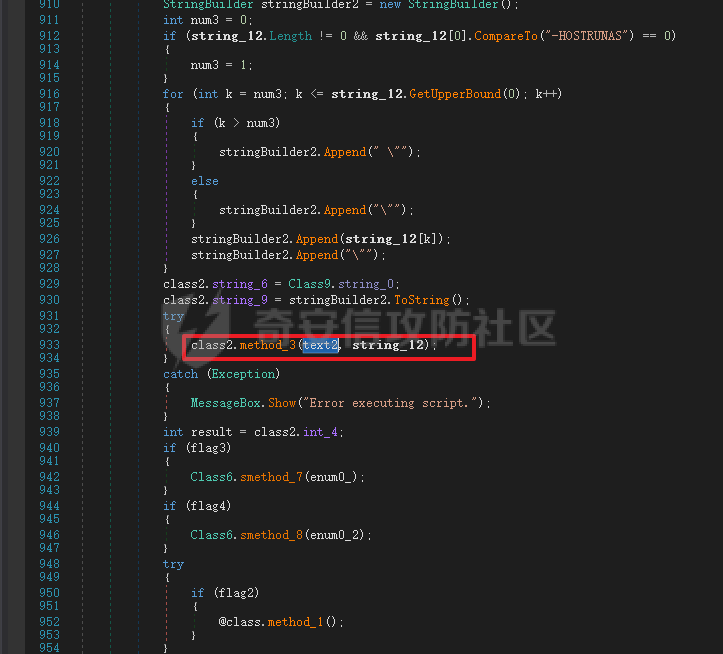 0x01 背景 ======= 某次应急事件中拿到一个攻击者使用的钓鱼样本,这个样本比较有意思和之前的分析有些不同,第一次分析也算曲折,此文记录下对该样本的分析过程。 样本如下:  伪装成某某OA的一个升级的程序(发起钓鱼的攻击者,通过伪装成某某OA工作人员) 0x02 样本行为分析 =========== 一般笔者拿到样本之后会先丢到虚拟机里面跑下(这里要注意一些反虚拟机操作),然后看下各方面的特征,如注册表修改、新建进程、网络外联情况等。 运行样本:  首先通过ApateDNS看到可疑dns请求:  进一步查看sysmon:可以看到对应时间,是进程mobsync.exe发起的上面可疑域名的dns请求:  同时我们往前看几条,也就是发起dns前,可以看到有一个进程创建操作,详情如下:  如上图,我们可以看到这个mobsync.exe其父进程就是样本进程,所以这个进程我们的样本进程创建运行的,所以我们这里其实是直接就拿到了c2地址。 进一步我们看下mobsync.exe这个进程干了些啥,如下图pcmonitor监测到其修改涉及internet Explorer 安全区域的信息的注册表,来增加成功回连的概率:  这里笔者进一步通过inetsim 模拟真实环境,其实就是给样本一个回连的https服务,看看其网络行为: inetsim记录如下:如下图,好家伙直接空手套白狼,拿到回连的url了,ps:看着就像CS;  通过模拟环境的行为分析到这就差不多了,接下来就是样本文件逆向分析了,毕竟谁知道上面的这个些是不是攻击者给我们设置的陷阱呢?(比如当他的反虚拟化比我们的反反虚拟化做的多的时候,那么攻击者的样本里面检测到这个是虚拟环境,就随便弄些行为让我们分析的人去分析,回连一些正常域名/IP等,ps:这个样本回连域名正好就是这个情况,比较特殊,所以全文笔者都把域名脱敏了)。光从行为侧去下结论是不太行的。 0x03 样本逆向分析 =========== 一、前置工作: ------- 先来看下样本结构: 通过die我们可以看到其用Smart Assembly做了一次混淆  直接通过de4dot来反混淆:拿到解混淆之后的:  再丢到die里面:  首先这个exe没有导入和导出表,只有两个节,代码节和资源节:  除此之外,翻资源节的时候发现,存在一个比较特殊的标记,sapien powershell v5 host xxx的  笔者google找了下这个东西:发现是一个叫[PowerShell Studio](https://www.sapien.com/software/powershell_studio)的特征,是sapien公司的。  接着直接问chatgpt这个是干啥的:  我们可以得到一个结论这个工具可以用来对powershell代码保护以及封装成一个可执行文件。所以我们这里的样本文件很大可能是这么来的。 如下图,通过启发式扫描,这个样本可能是一个.net的c#程序(这里也印证了上面我们的推测,因为powershell也是基于.net的,所以兼容c#),但是也正是因为这个基于.net所以我们的ida之类的反编译工具不太行了。  接着我们用dnspy来反编译这个通过.net c#开发的exe文件,将其从中间语言还原成c#源码: 定位入口:  二、代码分析: ------- ### 1、静态分析: 主函数代码如下:  如上图,可以看到,这个样本逻辑里面还是做了一些反调试操作的,第65-68行通过kernel32里面的IsDebuggerPresent()函数来检测进程是否被调试; 还有第69行的Class7.smethod3方法,如下图是其实现,可以看到是通过kernel32里面的CheckRemoteDebuggerPresent()来检测当前进程是否被调试:  接着,来到主要方法 Class9.smethod\_11():  接着我们跟进该方法:  直到如下下图处,非常可疑,这里读取资源段里面的内容,并赋值给array3数组。  然后调用了一个smethod\_7的方法对这个array3数组进行操作,最后得到var4,这个函数传入了一个特殊的写死的数组和num2  写死的数组内容如下:  num2其实就是array3的长度:  分析到这的时候,笔者猜测这里这个函数在做一些解密操作。 我们跟进来看下Class9的smethod\_7来看下,如下图,简单看下,其实就是一个长度for循环,对传入的byte\_0参数进行一顿操作,其中包括加106,减byte\_1里面对应for轮数的索引的值(超过长度会自动清零 338-342行),之后对一堆情况判断,比如但钱轮数是否是5的倍数,是的话byte\_0的对应字节要加2,等等之类的  这里我们没必要去深入分析,因为不需要知道具体是这么干的,我们只需要知道这个函数就是在解密就行。解密的逻辑就是上图。 当然要是搁以前我肯定是不会去分析的,但是现在不一样了,现在我们有gpt了,直接让gpt来分析具体功能细节,反正我又不用动手,如下图是gpt对该函数的分析结果:和我们看的差不多。  接着我们回到上层函数:解密后的array4变量的内容放到了text2里面:  接着我们跟下这个text2:如下图,被丢到class2.method\_3里面了:  跟进方法:如下图,我们还是重点关注传入的解密后的tex2,也就是这里的形参tstring\_10,下图,我们看到就是进行了一个替换操作,把之前的里面`#SAPIENPRESETS`替换成`$PSScriptRoot = \"{0}\"\r\n`+`$PSCommandPath = \"{0}\"\r\n`,其实这里就是获取当前路径和运行的进程路径  替换之后直接丢到`Runspace.CreatePipeline.Commands.addscript()`里面,这里其实就是把我们解密后的内容当成powershell脚本语言运行了; 分析到这,我们静态分析就差不多了; ### 2、动态分析 这里我们直接在下面打一个265行打个断点,然后dump下string\_10变量内容,直接拿到攻击者的powershell脚本:  如下图,我们拿到运行的脚本:  dump下来,用unicode编码打开:  如下图是最后还原的代码:  下面一堆代码,特别长,主要是一些ui之类的命令和资源的存储,比如运行样本的图标之类的,我们来看关键的地方: 首先发现一个函数inject
