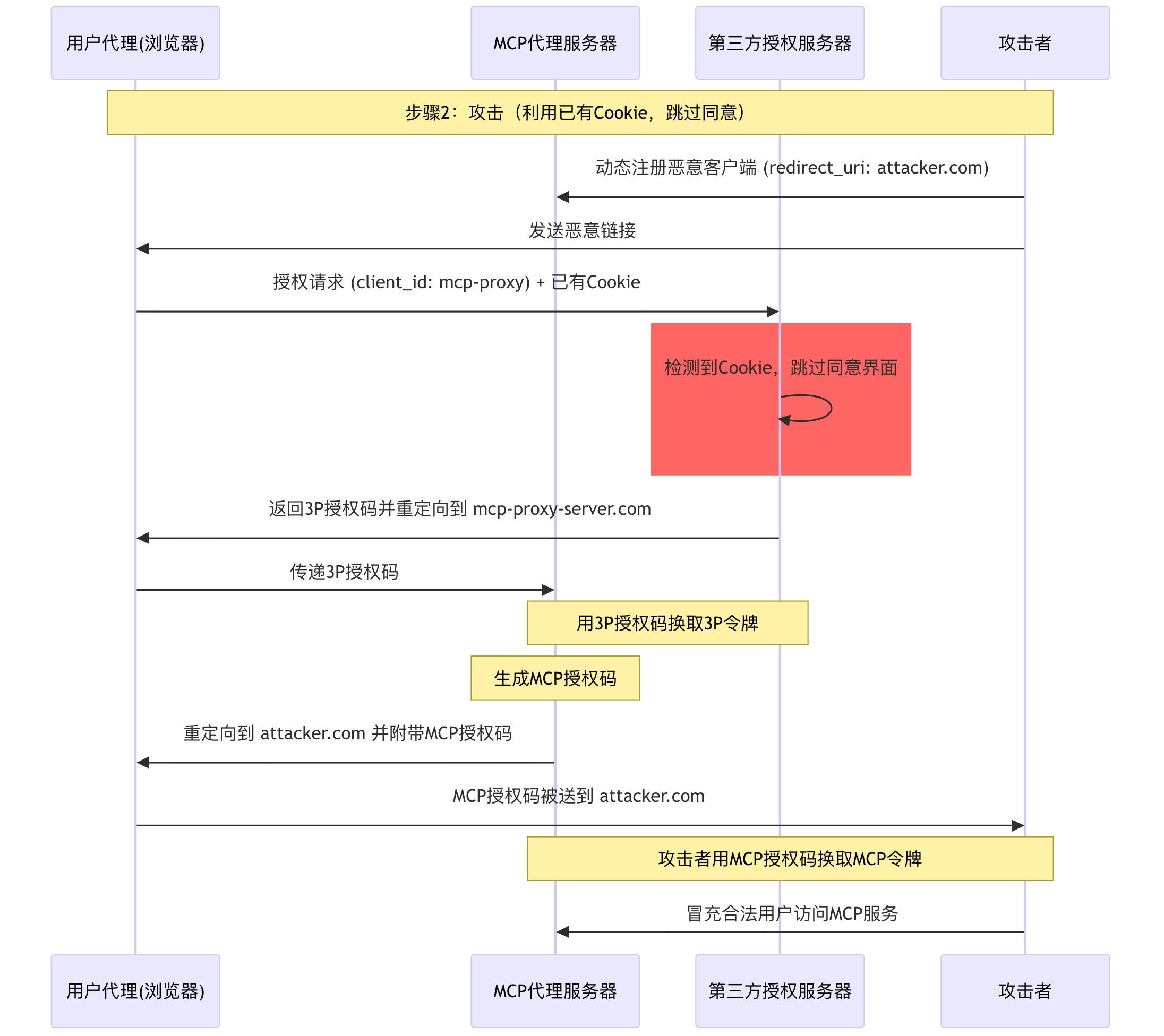 在大模型和智能应用快速发展的今天,Model Context Protocol(MCP)逐渐成为连接模型与外部服务的重要标准。它让开发者可以更方便地调用第三方 API,为模型提供更多上下文能力。但与此同时,**安全问题也随之而来**。 如果说 OAuth 2.0 曾经是互联网授权的“护城河”,那么 MCP 的兴起意味着我们需要重新思考:**如何在模型调用的上下文中,避免被攻击者钻空子?** 今天我们就来拆解 **MCP 实现中的三大安全风险**: 1. **混淆副手问题(Confused Deputy)** 2. **Token Passthrough(令牌透传)** 3. **会话劫持(Session Hijacking)** 并逐一解析它们的攻击流程、危害,以及官方推荐的防御措施。 - - - - - - 混淆副手问题:当代理成了“帮凶” ---------------- 在分布式系统和授权协议中,有一个经典陷阱:**Confused Deputy Problem(混淆副手问题)**。直白点说,就是一个“好心办坏事”的代理,被攻击者利用,成了帮凶。 ### 背景 MCP 代理服务器的常见角色是: - **MCP Proxy Server**:连接 MCP 客户端与第三方 API; - **第三方授权服务器**:负责保护 API 的授权; - **第三方 API**:提供具体功能,依赖授权服务器签发的令牌访问。 通常情况下,MCP 代理会用一个 **固定的 Client ID(Static Client ID)** 去对接第三方授权服务。这样做简化了架构,但也埋下了隐患。 ### 架构和攻击流程 #### 正常的OAuth代理使用(保留用户同意)  #### 恶意的 OAuth 代理使用(跳过用户同意)  ### 攻击流程 正常情况下,用户会通过代理去访问 API,授权服务器会弹出 consent 界面,让用户确认授权。 但如果攻击者掌握了技巧,就可能这样操作: 1. 用户正常完成过一次授权,此时浏览器里已经存有 consent 的 Cookie。 2. 攻击者构造一个恶意请求,伪造 redirect\_uri,骗用户点开链接。 3. 浏览器携带 Cookie 发给授权服务器。因为已有记录,授权服务器会跳过 consent 界面。 4. 授权码被下发到攻击者指定的恶意地址。 5. 攻击者用这个授权码换取 token,从而冒充用户访问 API。 换句话说,**代理因为使用静态 Client ID,帮攻击者绕过了用户确认环节**。 ### 缓解措施 - **MUST**:每个动态注册的客户端,都要单独获得用户的同意。 - 即使第三方授权服务不支持动态注册,MCP Proxy 也必须额外补齐 consent 流程。 - - \* Token Passthrough:危险的“令牌透传” --------------------------- 很多开发者可能会觉得,既然 MCP 客户端已经拿到了 Token,直接转发给下游 API 就好了。**但这恰恰是一种反模式。** ### 风险分析 所谓 “Token Passthrough”,指 MCP 服务器不验证令牌的合法性(是否颁发给自己),直接将客户端提供的令牌转发给下游服务。这样做会带来以下问题: - **绕过安全控制**:下游 API 的限流、身份校验等机制失效。 - **审计难度大**:MCP 服务器无法区分不同客户端,日志中身份混乱。 - **信任边界被打破**:下游服务误以为所有请求都来自代理,实际却可能是攻击者伪造的。 - **未来兼容性风险**:一旦系统需要引入更严格的安全控制,透传模式将成为巨大负担。 ### 缓解措施 - **禁止透传**。MCP 服务器 **必须拒绝** 一切不是专门颁发给它的令牌。 - 所有令牌的 **audience(受众字段)** 必须检查,确保只服务于 MCP 自身。 - - \* 会话劫持:ID一旦泄露,权限瞬间丢失 ------------------ 另一大风险是 **Session Hijacking(会话劫持)**。简单来说,就是攻击者窃取或猜到某个用户的 Session ID,继而冒充该用户执行操作。 ### 攻击方式 MCP 场景下,常见的会话攻击有两类: #### (1)Prompt Injection 劫持  - 客户端连到 Server A,拿到一个 Session ID。 - 攻击者窃取这个 ID,然后在 Server B 发起恶意请求。 - 由于多服务器共享队列,恶意请求被当成正常事件投递。 - 最终客户端收到伪造响应,可能被诱导执行危险操作。 #### (2)Impersonation(身份冒充)  - 用户登录 MCP 服务器,生成持久会话。 - 攻击者拿到这个 Session ID。 - 服务器不再进行二次验证,直接认为攻击者就是合法用户。 - 整个系统的访问权限就此沦陷。 ### 缓解措施 要避免会话劫持,MCP 官方提出了一套明确的防护实践: 1. **会话不可作为认证手段**:所有请求都要进行严格授权验证。 2. **Session ID 必须安全生成**:使用安全随机数(如 UUID),避免可预测序列。 3. **会话绑定用户信息**:不仅存储 session\_id,还要加上 user\_id,例如 `<user_id>:<session_id>`。 4. **Session 定期轮换/过期**:减少长期泄露带来的风险。 5. **额外唯一标识**:在必要时结合设备指纹、IP 校验,增加攻击门槛。 - - - - - - 为什么这些风险值得重视? ------------ MCP 的目标是把模型变成更“有上下文”的工具,但一旦代理、令牌或会话被滥用,攻击者可能获得: - **持久访问第三方 API 的能力**(无需用户同意); - **越权操作**(绕过权限和审计机制); - **数据泄露通道**(利用透传或代理盗取信息)。 更可怕的是,这些攻击往往隐藏在正常调用流中,不易被发现。 - - - - - - 最佳实践总结 ------ 从今天的分析可以看到,MCP 安全的关键不在于“防护一切”,而在于: - **明确信任边界**:代理不是透明管道,而是需要强验证的安全边界。 - **最小化信任假设**:任何静态 ID、透传令牌、持久会话都可能成为突破口。 - **内置安全机制**:日志审计、随机 Session ID、用户 consent 全都要到位。 一句话总结: **把 MCP 当作独立安全主体来设计,而不是 OAuth 的简单中转。** 无论你是开发者,还是安全审计人员,都需要牢记: - 代理要谨慎,避免被“混淆”; - 令牌要严格,绝不能透传; - 会话要