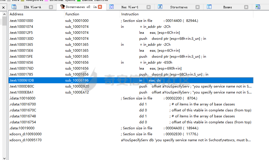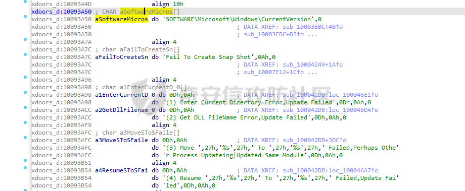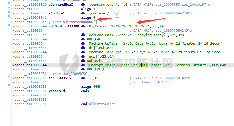 0x00 前言 ------- 本文主要是通过IDA对一个恶意dll样本进行分析,来熟悉IDA的基本操作,也可以了解到一些恶意样本的底层逻辑。 ### 0x01 Dllmain 的地址是什么? BInary file: 二进制文件 选Binary file这个选项 是因为恶意代码有时候会带有shellcode、其他数据、加密参数,甚至在正常的PE文件中带有其他exe可执行文件,并且当包含这些附加数据的恶意代码在Windows上运行或者被加载到IDA 时,它不会被加载到内存中。因此,当加载一个包含shellcode的原始二进制文件时,应当将这个文件作为二进制文件加载并且反汇编。 但是这里切记刚开始就选portable 模式,不要选Binary FIle,我刚开始就选的Binary File,怎么也找不到入口点,具体原因还未知…… [](https://cdn-yg-zzbm.yun.qianxin.com/attack-forum/2021/10/attach-f846175ae1fd303c5b2bf5bf0f43e6778d7a0cf7.png) 就像下面一样 [](https://cdn-yg-zzbm.yun.qianxin.com/attack-forum/2021/10/attach-0a4e978f0014079fcd2bba9c18d1a77a7ee30b19.png) [](https://cdn-yg-zzbm.yun.qianxin.com/attack-forum/2021/10/attach-db0aed0d10728fedf76cb1cf283f9087e87c1e85.png) 跳转到 `1000D02E`处,这里 开始执行汇编指令的地方才是 dllmain 函数的入口点,虽然前面这个地址也有很多行,但都是注释,并没有实际含义。 [](https://cdn-yg-zzbm.yun.qianxin.com/attack-forum/2021/10/attach-e98158ca02b79fb32c6a87cbdee476990f7000ed.png) 切忌分析前面的那一段,因为所有从 `DllEntryPoint` 到 `Dllmain` 之间执行的代码一般是由编译器生成的。 ### 0x02 使用imports窗口并浏览到 gethostbyname,导入函数定位到什么地址? 首先定位下这个函数, [](https://cdn-yg-zzbm.yun.qianxin.com/attack-forum/2021/10/attach-5eae513900fa4118ea2450101bcbfc7ad4bb721d.png) 最终定位的地址就是 `idata` 区段的 `100163CC` 处 [](https://cdn-yg-zzbm.yun.qianxin.com/attack-forum/2021/10/attach-f9f8bd6e84cdd1461c43ba7405476d157167d4bf.png) ### 0x03 有多少函数调用了gethostbyname? 右键该函数名, `Jump to xref to operated` [](https://cdn-yg-zzbm.yun.qianxin.com/attack-forum/2021/10/attach-895efe6061bc85359e02fe4737fc0b8219ae6bdf.png) [](https://cdn-yg-zzbm.yun.qianxin.com/attack-forum/2021/10/attach-03ca308fc0a268819104980299c30c9361670f3b.png) `Type` 中的 `r` 是 read,读取的意思,函数首先要被cpu读取,才能够被调用, `Type`中的`p`是被调用的引用 这里就是5个函数一共调用了9次`gethostbyname`函数 ### 0x04 0x10001757 处,哪个DNS请求将被触发? 首先 g 跳转到 `0x10001757` 这个地址 [](https://cdn-yg-zzbm.yun.qianxin.com/attack-forum/2021/10/attach-a7d3f70d4aa06fa01bf1efcb9870c839d1db6c49.png) 简单分析下这段汇编 首先, 将 `off_10019040` 赋值给 `eax` 寄存器,接着 地址位 + 0Dh(转换为10进制就是13),就是将地址往后偏移 13 位,然后`push` 入栈,接着 `call` 调用 `gethostbyname` 参数。 大概流程是这样,要找 被触发的dns请求,就一个个分析地址吧。先拿`10019040` 开刀, [](https://cdn-yg-zzbm.yun.qianxin.com/attack-forum/2021/10/attach-c8924d52ef1fe3bbdf11ccd7a08c87d2f7d3a799.png) 找到了一串字符串,跳转到这里看一看,找到完整的字符串 `pics.praticalmalwareanalysis.com` [](https://cdn-yg-zzbm.yun.qianxin.com/attack-forum/2021/10/attach-d4fe3f0699bfc0a217c6932b76c0ded51a1de616.png) 所以,`off_10019040` 是一个字符串指针,指向字符串的 `[This is RDO]pics.praticalmalwareanalysis.com` 的第一个字符,然后`add 0Dh` 后,偏移13位,指向字符p,最后 `push`入栈的值是 `pics.praticalmalwareanalysis.com` ### 0x05 IDA 识别了在 `0x10001656` 处的子过程中的多少个局部变量? 还是先跳转到这里, [](https://cdn-yg-zzbm.yun.qianxin.com/attack-forum/2021/10/attach-afbd08ef637a88bb1e54417929aeda09f2260109.png) 数一数,一共24个局部变量。 [](https://cdn-yg-zzbm.yun.qianxin.com/attack-forum/2021/10/attach-6dd6725d659fa90c1a4c95076e14e0330ec18748.png) ### 0x06 IDA Pro 识别了在 `0x10001656` 处的子过程中的多少参数? 首先搞清楚参数的定义: 参数是调用这个函数的函数传递给被调用函数的值 很明显,这里只传入了一个 `LPVOID`类型的参数 `lpThreadParameter` [](https://cdn-yg-zzbm.yun.qianxin.com/attack-forum/2021/10/attach-7ca9a6813d75eee83f975ce332ab695acc4b5462.png) ### 0x07 使用string窗口,在反汇编中定位字符串\\cmd.exe /c。它位于哪? string 窗口: `shift+f12` [](https://cdn-yg-zzbm.yun.qianxin.com/attack-forum/2021/10/attach-5e7fdf0ab4b22905bff33a142af25f69268b522b.png) 定位 cmd.exe 的地址 [](https://cdn-yg-zzbm.yun.qianxin.com/attack-forum/2021/10/attach-faf64b944ae2d803e3b474b0afc636e99989d462.png) [](https://cdn-yg-zzbm.yun.qianxin.com/attack-forum/2021/10/attach-0c513ee495708f83c0be6b1f82902b51fd0bc084.png) 定位到地址: `xdoors_d:10095834`处 ### 0x08 在引用 `\cmd.exe /c` 的代码所在的区域发生了什么? 首先查找 `cmd.exe` 的引用源, 右键 [](https://cdn-yg-zzbm.yun.qianxin.com/attack-forum/2021/10/attach-05e3eea1c0bf5c8f57731ecdbf2b5fbfe062f03f.png) [](https://cdn-yg-zzbm.yun.qianxin.com/attack-forum/2021/10/attach-0bc4b4a1b61dc09287cc90eb69fed821133aa4e5.png) 下面就分析下这段汇编 [](https://cdn-yg-zzbm.yun.qianxin.com/attack-forum/2021/10/attach-627475a4b8c2449469efe1690f6b7799c80f5fee.png) 首先第一眼看到的是将 `\\cmd.exe /c` 字符串 `push` 入栈, 点击字符串,跳转 [](https://cdn-yg-zzbm.yun.qianxin.com/attack-forum/2021/10/attach-cdc4341c971dfd8b75d40f74802023cf5cdc5380.png) 看到这些字符串, `Hi… Welcome… Machine Uptime… Machine IdleTime…Encrype Magic… Remote Shell Session…` 大概也能猜到这是一个获取机器信息的远程shell会话 定位一下字符串的地址,看到还有 `language /robotwork /mbase /mhost`等等,获取的都是一些系统信息 [](https://cdn-yg-zzbm.yun.qianxin.com/attack-forum/2021/10/attach-cd03301261d02e83c71ea0a5f519