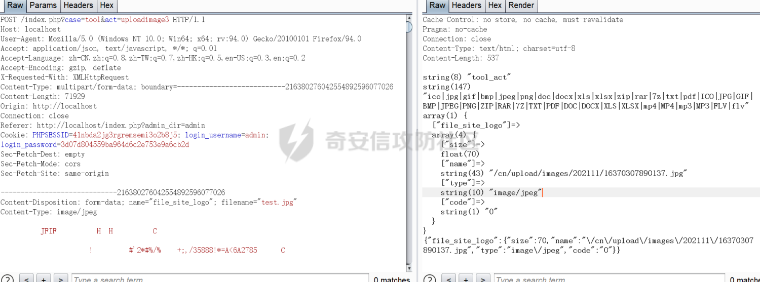 ### 前置知识 在分析审计代码之前先来看一下index.php文件中的代码,对CMS的路由等有个了解 `index.php` 前面代码部分会对一些类进行加载校验,诸如数据库连接等类。这里会对`front`类进行实例化并调用类中的`dispatch`方法,跟进代码来仔细看一下 [](https://cdn-yg-zzbm.yun.qianxin.com/attack-forum/2021/11/attach-1ae6d0271b9215ade38d5c49450291bd49cb56fa.png) `/lib/tool/front_class.php` `dispatch`方法会对类是否存在进行一个校验,如果类不存在直接抛出异常,`$case`变量以及`$act`都是通过GET方式进行获取的,之后会对`$act`进行一个拼接赋值给`$method`,之后去类中寻找对应的方法,如果存在就可以调用类中的方法,不存在就会抛出异常 [](https://cdn-yg-zzbm.yun.qianxin.com/attack-forum/2021/11/attach-1a463eece1f3fc4c14f4d4b8af8ed4eaa9f5c72d.png) 还需要注意的是后台功能模块或是调用类中方法的时候都会自带两个参数`site=default&admin_dir=admin`,这两个get参数部分功能点通过抓包能够看到,所以最好是在请求的时候自己写上 ### upload 还是常规思路,先对存在上传的功能点进行分析。登录管理员后台,上传功能点有多个,这里对上传logo功能点进行尝试,设置->全局设置->网站logo,上传正常的图片同时进行抓包 [](https://cdn-yg-zzbm.yun.qianxin.com/attack-forum/2021/11/attach-f9213ab07e22df1cc9f17a391a5251884af44753.png) [](https://cdn-yg-zzbm.yun.qianxin.com/attack-forum/2021/11/attach-ae633504953d62652e51fe7a1e4ce47aab859d87.png) 能够正常上传图片,修改后缀为PHP上传失败,常见的绕过方法都没有用,将请求转换成表单的形式也没有办法进行上传,根据前面提到调用的方法形式,来找到类以及类中的方法进行审计 `/lib/default/tool_act.php#556` ```php function uploadimage3_action() { $res = array(); $uploads = array(); if (is_array($_FILES)) { $upload = new upload(); $upload->dir = 'images'; $upload->max_size = config::get('upload_max_filesize') * 1024 * 1024; $_file_type = str_replace(',', '|', config::get('upload_filetype')); foreach ($_FILES as $name => $file) { $res[$name]['size'] = ceil($file['size'] / 1024); if ($file['size'] > $upload->max_size) { $res[$name]['code'] = "1"; $res[$name]['msg'] = lang('attachment_exceeding_the_upper_limit') . "(" . ceil($upload->max_size / 1024) . "K)!"; break; } if (!front::checkstr(file_get_contents($file['tmp_name']))) { $res[$name]['code'] = "2"; $res[$name]['msg'] = lang('upload_failed_attachment_is_not_verified'); break; } if (!$file['name'] || !preg_match('/\.(' . $_file_type . ')$/', $file['name'])) continue; $uploads[$name] = $upload->run($file); if (!$uploads[$name]) { $res[$name]['code'] = "3"; $res[$name]['msg'] = lang('attachment_save_failed'); break; } $str = (config::get('base_url')==""?"":config::get('base_url')) .$uploads[$name]; $res[$name]['name'] = $str; $res[$name]['type'] = $file['type']; $res[$name]['code'] = "0"; apps::updateimg($uploads[$name],ROOT.$str); } } echo json::encode($res); } ``` `uploadimage3_action`方法对上传的文件进行了处理,首先对文件类型、大小等进行了获取,并从已申明的常量中获取了允许上传的文件类型即文件名后缀,也就是说这里做了白名单校验,只有在白名单当中的文件才能够上传成功;之后调用了`front`类中的`checkstr`方法对文件内容进行了校验,跟进一下方法 [](https://cdn-yg-zzbm.yun.qianxin.com/attack-forum/2021/11/attach-797c2fa0533913a95c9e18eec5d272d1806704ec.png) `checkstr`方法写了一个黑名单匹配规则,只要匹配到黑名单当中的字符串内容,就直接返回`false`,那么也无法成功上传,这样子图片马必须采用短标签的形式进行写入,利用的前提是php的配置解析短标签,并且存在可控的文件包含点 之后对文件后缀进行校验,如果符合要求就会调用`upload`类中`run`方法进行文件存储路径的创建 [](https://cdn-yg-zzbm.yun.qianxin.com/attack-forum/2021/11/attach-ebac6cef548363e3fe7a02d8463505a5272767eb.png) 下面通过调试直接输出一些变量值 [](https://cdn-yg-zzbm.yun.qianxin.com/attack-forum/2021/11/attach-4cafcadbc61eb65a256debfa09d8aa87f96ee230.png) 可以看到允许上传的所有文件类型,以及对文件处理之后生成的绝对存储路径,这里看到允许上传压缩包的时候想到了之前审计的`CMS`,`getshell`的方法就是通过在压缩包中放入shell文件,之后cms进行解压缩操作,已知上传之后的路径;那么接下来就需要找到对压缩包进行解压缩操作的方法 `lib/plugins/filecheck/tool/phpzip#unzip` [](https://cdn-yg-zzbm.yun.qianxin.com/attack-forum/2021/11/attach-8f5e2e516e92824f023f5e04fe0b565e3ef98f07.png) 通过全局代码搜索找到unzip方法,但是index.php并不会包含该类,那么上传压缩包进行getshell的方法就不可行了 [](https://cdn-yg-zzbm.yun.qianxin.com/attack-forum/2021/11/attach-827f699f5114b0c0fa1105579245304c5ba4aae5.png) 看起来功能点结合getshell就到这里了。接下来转变一下思路,还记得之前审过的cms能够通过控制器调用方法远程下载vps上的文件,那么一样能够达到getshell的目的,那就跟着思路去找找看有没有类似的方法存在。 全局搜索类似`function download,downfile`的关键词,找到了几处,经过审计确认其中一个可能可以满足需求 `lib/admin/update_admin.php#85` [](https://cdn-yg-zzbm.yun.qianxin.com/attack-forum/2021/11/attach-e470378e5d3f463de1d967bda02757b2bbe889b2.png) 通过调用`front`类的`get`方法获取`url`参数,之后调用本来中的`get_file`方法,跟进,这里就是对指定的文件进行了下载保存,那么应该可以远程下载我们的`shell`文件了;之后会调用`PclZip`类中的`extract`方法对上传的压缩包进行解压缩并对已经存在的文件进行覆盖,下面的代码还会对指定的`sql`文件进行覆盖并重新加载`sql`