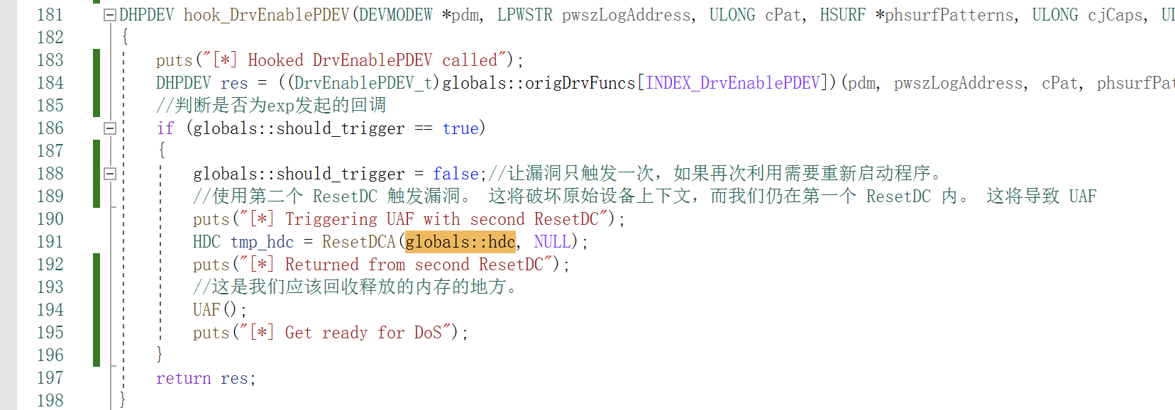 **作者:维阵漏洞研究员--hk** 概念说明 ---- **1、UAF漏洞** UAF漏洞全称是use after free,free是指函数是在堆上动态分配空间后不再使用该数据从而被回收。但是由于程序员的一些不适当的操作,会导致攻击者能够操控已经被释放的区域,从而执行一些byte codes。 利用uaf漏洞主要是注意几点: 1)在free()函数被调用回收buffer之后,指向该地址的指针是否被重置。 2)后续是否存在malloc()函数可以将新申请分配的空间分配到之前被free()回收的buffer区域。 3)利用没有被重置的指针进行攻击 **2、数据结构** 我们先了解一下相关结构体的定义,参考自NT4.0的源码dcobj.hxx#L97、dcobj.hxx#L236、dcobj.hxx#L1282、dcobj.hxx#L1686,另外HDC犹如其名,handle to device context,图形设备信息对象的句柄。 **3、C++ namespace(命名空间)关键字** 在C++中,您可能会写一个名为xyz()的函数,在另一个可用的库中也存在一个相同的函数xyz()。这样,编译器就无法判断您所使用的是哪一个 xyz()函数。因此,引入了命名空间这个概念,专门用于解决上面的问题,它可作为附加信息来区分不同库中相同名称的函数、类、变量等。使用了命名空间即定义了上下文。本质上,命名空间就是定义了一个范围。 定义命名空间: ` namespace namespace_name { // 代码声明 } ` 引用命名空间中的变量: ` name::code; // code 可以是变量或函数 ` 漏洞背景 ---- 2021年10月12日,卡巴斯基博客公开披露了在8月下旬捕获到的Windows内核提权0day漏洞的相关信息。该漏洞与Windows窗口管理和图形化设备接口相关(Win32kfull.sys)。通过该漏洞可以让普通权限用户提权到system权限。 漏洞现状 ---- 以下版本均受影响。卡巴斯基已经发现在野利用,且官方已发布补丁,请及时安装相关补丁。 Windows Server, version2004/20H2(Server Core Installation) Windows 10 Version1607/1809/1909/2004/20H2/21H1 Windows 7 for 32/64-bit Systems Service Pack 1 Windows Server 2008/2012/2016/2019/2022 Windows 11 for ARM64-based Systems Windows 11 for x64-based Systems Windows 8.1 for 32/64-bit systems Windows RT 8.1 漏洞成因 ---- win32kfull的NtGdiResetDC()函数中存在一个use after free漏洞,攻击者可以利用该漏洞将权限提升到NT AUTHORITY\\SYSTEM的权限。 由于此函数调用hdcOpenDCW(),该函数执行用户模式回调,因此存在该缺陷。在此回调期间,攻击者可以使用与之前相同的句柄再次调用NtGdiResetDC()函数,这将导致该句柄引用的PDC对象被释放。 关于对象被释放这一点,在微软官方的文章中提到:“调用CreateDC的线程拥有创建的HDC。当这个线程被销毁时,HDC不再有效。因此,如果您创建HDC并将其传递给另一个线程,然后退出第一个线程,第二个线程将无法使用HDC。” 然后,攻击者可以用自己的对象替换句柄引用的内存,然后将执行传递回原始NtGdiResetDC()调用,该调用现在将在没有适当验证的情况下使用攻击者的对象。这可以允许攻击者操纵内核的状态,并结合其他利用技术,以NT AUTHORITY\\SYSTEM的身份获得代码执行。 在win32kfull!NtGdiResetDC中调用了win32kfull!GreResetDCInternal:  在win32kfull!GreResetDCInternal中调用了用户态的win32kbase!hdcOpenDCW:  在win32kfull!GreResetDCInternal的85行,v11+0xAB8可以设置为我们想要执行的函数,同时v11+0x708和(new\_dcobj\[0\] + 6) + 0x708i64两个入参的值可以在用户态函数中被修改。内核函数接受两个用户态的参数,因此可以利用此漏洞造成任意地址读写。 漏洞利用 ---- 根据卡巴斯基的揭露,在执行ResetDC的回调函数时,对相同的句柄再次调用ResetDC,即可触发漏洞。利用此漏洞需要使用GDI palette对象和一个内核函数达到任意地址读写。可以利用NtQuerySystemInformation和EnumDeviceDrivers去泄露内核模块地址,最终可以进行权限提升。为了便于理解,下文将结合exp的内容进行说明。 **步骤0、获取exp自身的token对象地址** 准备后续提权所需的信息。先获取exp自身的token、特权信息在内核中的地址等信息。  获取exp自身的token方法如下:  进而筛选出PoolFlag=“ThNm”的堆。  安装Windows WDK后会自动生成一个pooltag.txt。pooltag.txt里有poolflag相对应的内容。如下图所示,不同的poolfalg标志代表了不同的数据类型。  **步骤1、hook对应的函数** 在下图736行中,调用SetupUsermodeCallbackHook()函数来hook可用打印机驱动的回调表。  hook步骤: 1、枚举可用打印机并获取驱动信息。 2、遍历每个驱动,如果找到目标函数则修改回调表。  **步骤2、创建一个全局的DC对象并保存其句柄**  **步骤3、调用ResetDC函数**  调用ResetDC函数,并向其传递全局DC的句柄。ResetDC函数执行系统调用NtDgiResetDC及其内部函数GreResetDCInternal并取得传入的HDC所对应的PDC对象,然后会调用hdcOpenDCW函数。  **步骤4、执行hook函数** ⚠️malloc()函数存在一个特性是会将新申请分配的空间分配到之前被free()回收的buffer区域。 ⚠️free()函数不会处理申请的内存空间的内容。所以数据会被保留下来。 调用ResetDC函数后会执行回调函数,由于已经hook对应的回调函数,所以代码流程进入HOOK函数。  如上图所示191行,再次执行ResetDC函数并传入全局的HDC值,由于第188行已经把globals::should\_trigger设为true,所以会按照正常的流程执行。 此时在GreResetDCInternal函数内会对该值对应的PDC对象进行释放,造成该对象结构的错误。 **步骤5、第二次ResetDC调用完成** 完成调用后继续运行到下图所示的70行。  对应的汇编代码如下:  \_guard\_dispatch\_icall\_nop的操作是jmp rax:  向上查看,可以看到rax=\*(rbx+0xAD0):  而RB